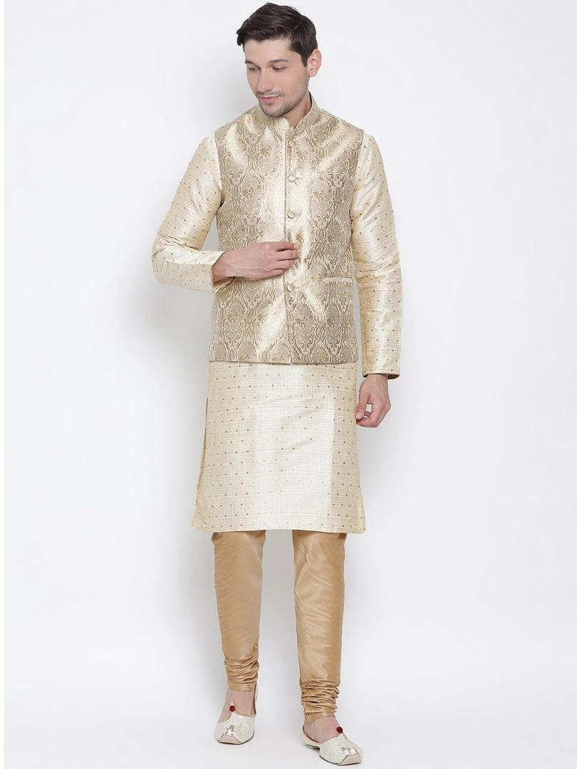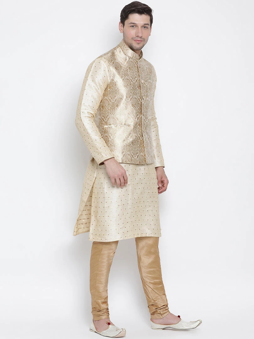 Beige and gold woven kurta with Gold solid Pyjama and beige Nehru jacket
