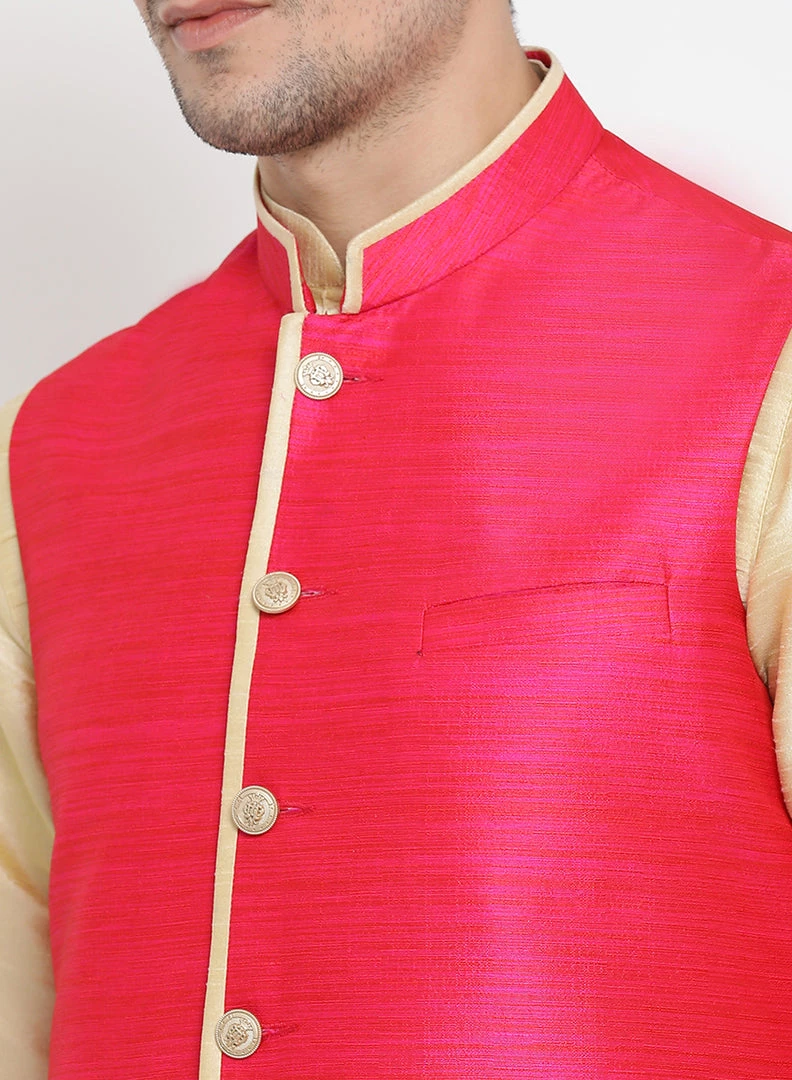 Pink Woven Nehru Jacket, Regular style, regular-length, has a Mandarin collar, sleeveless, straight hem, and has one pocket