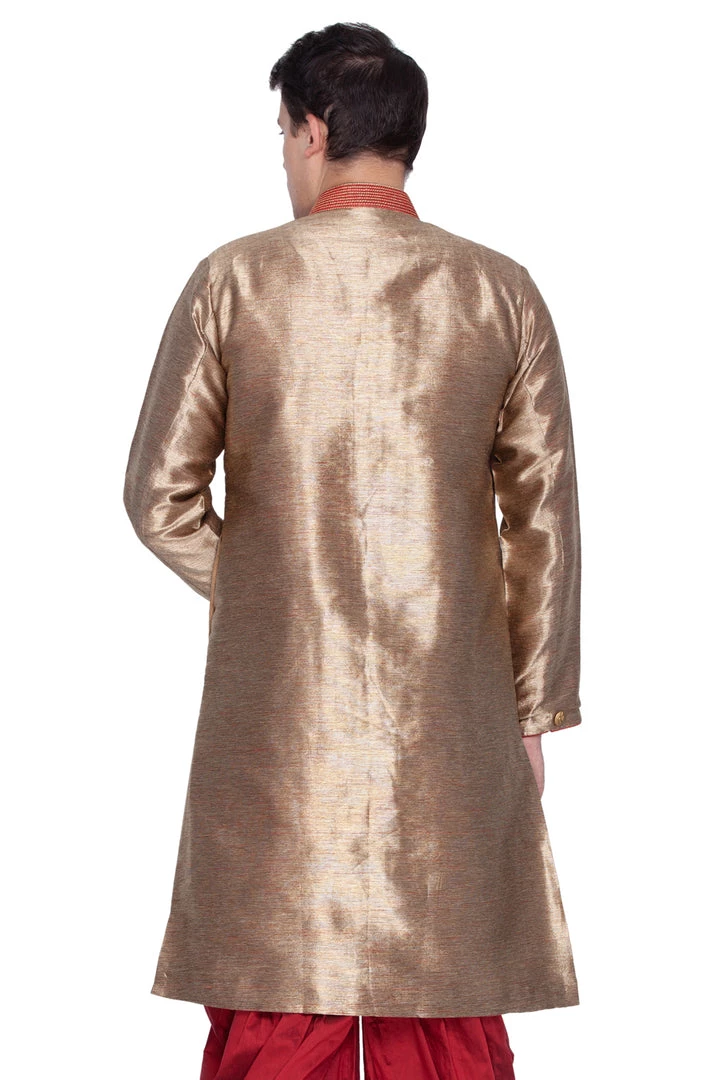Golden woven straight knee length kurta, has a mandarin collar, long sleeves, full front button placket, a welt pocket and straight hem
