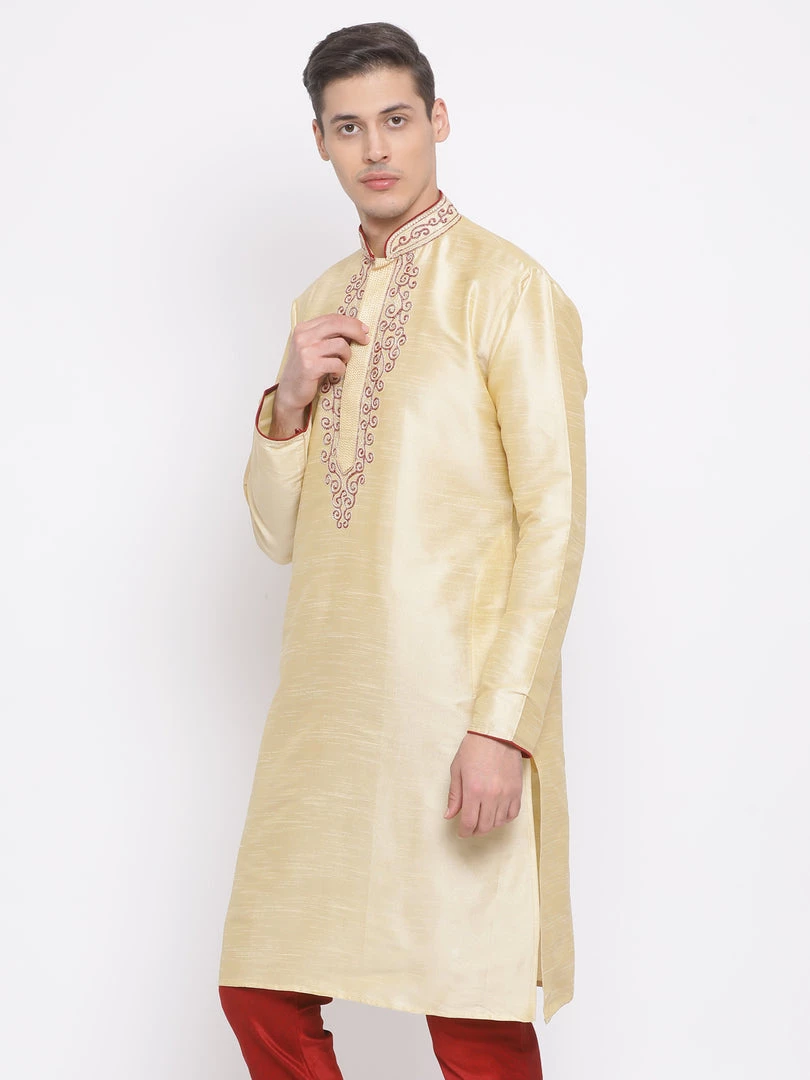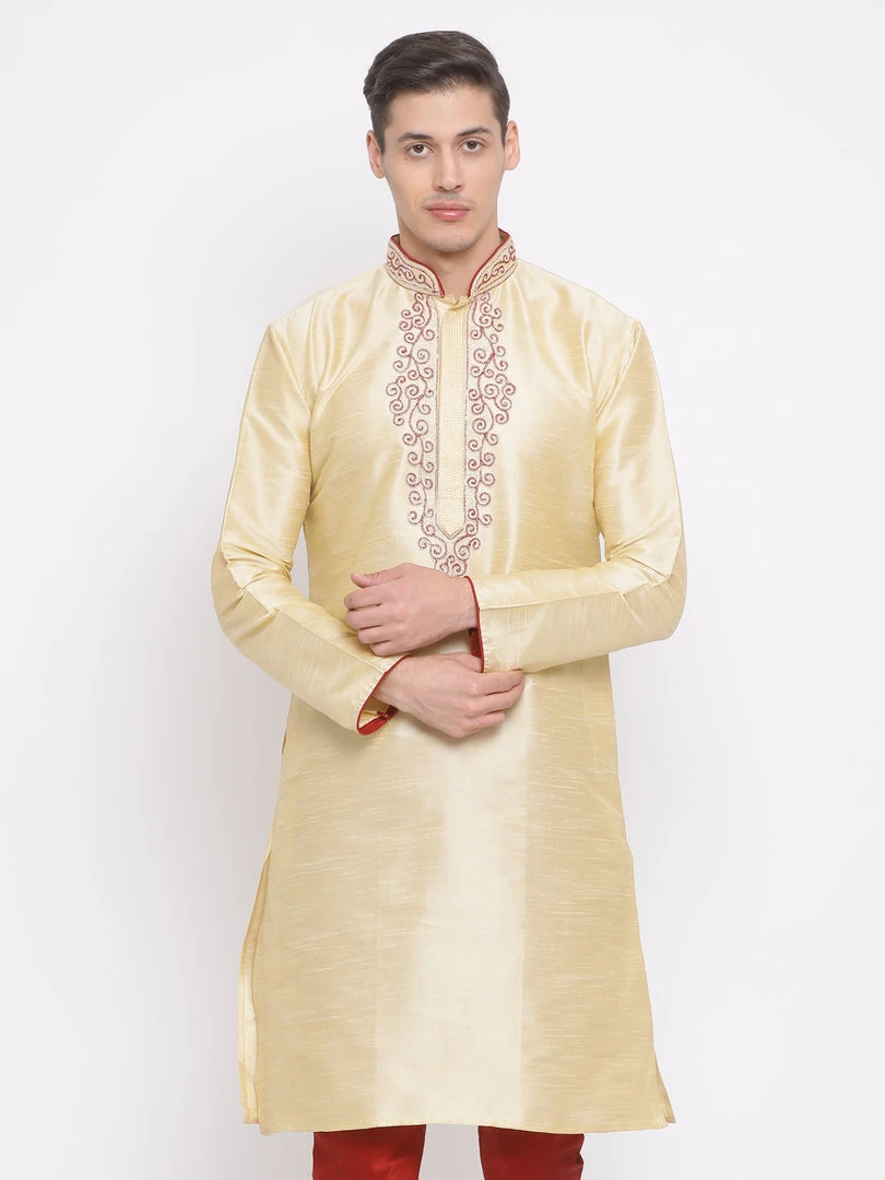 Golden knee length straight kurta, has a mandarin collar, long sleeves, button placket, embroidery detailing on collar and placket, straight hem and side slits