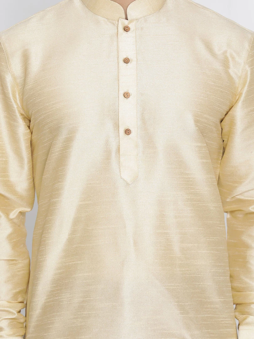 Golden straight above knee length kurta, has a mandarin collar, long sleeves, button placket, curved hem, and side slits
