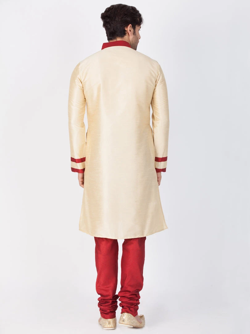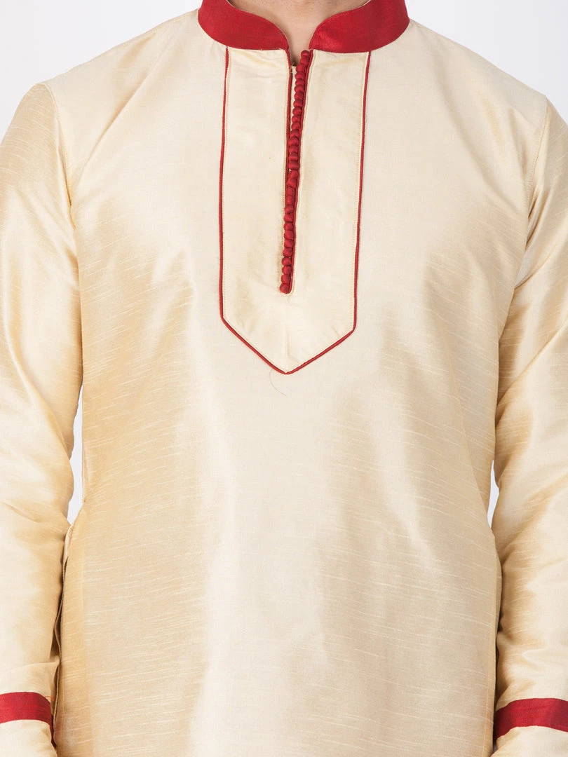 Gold toned solid straight knee length kurta, has a maroon mandarin collar, long sleeves, contrast maroon border on sleeves, button placket, straight hem
