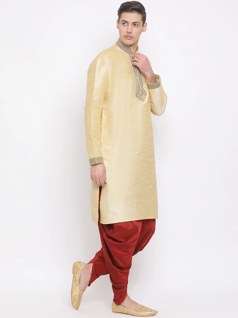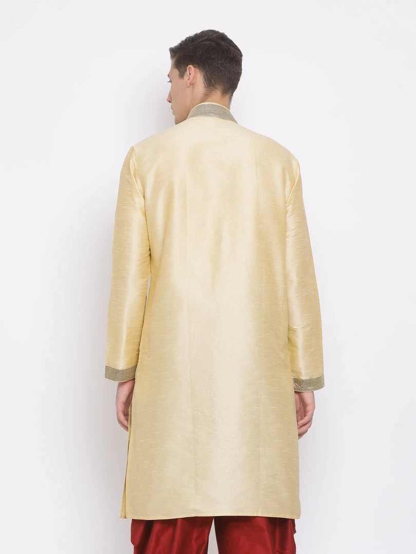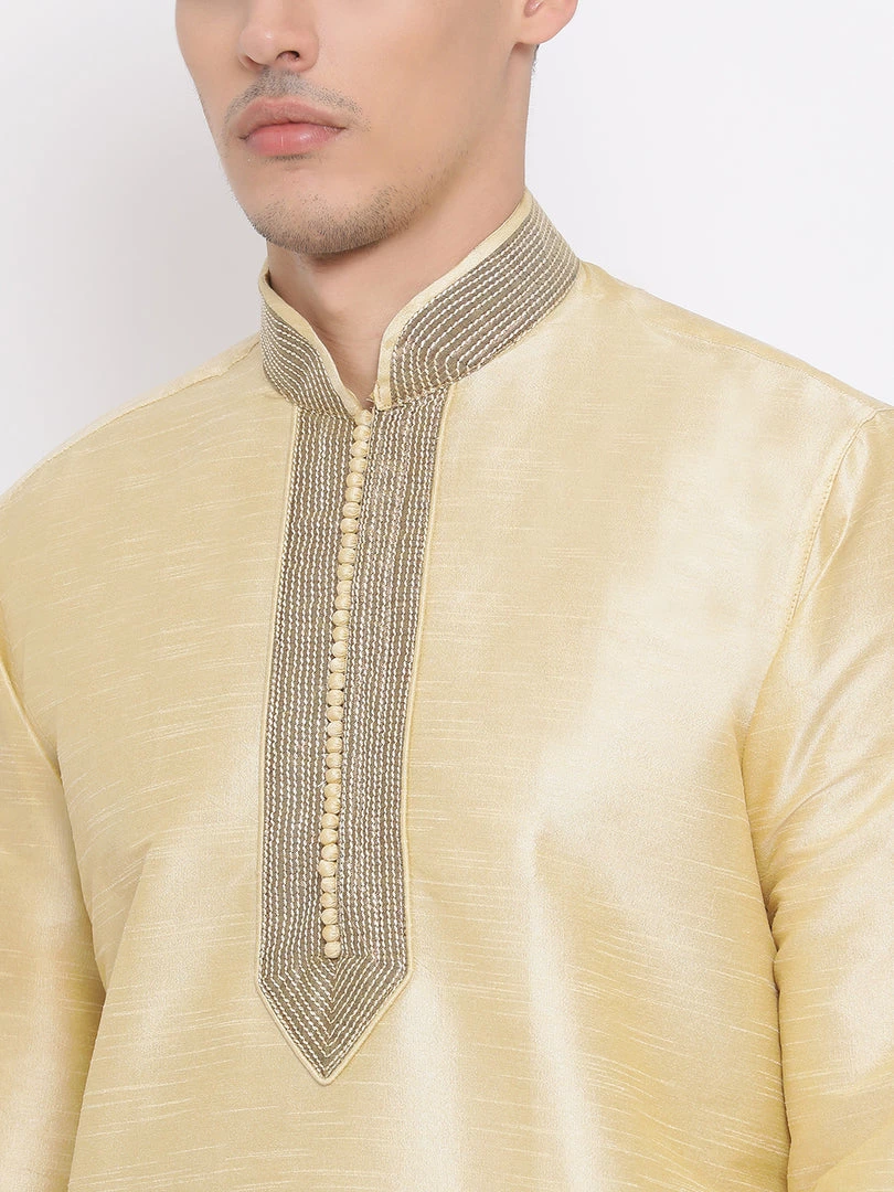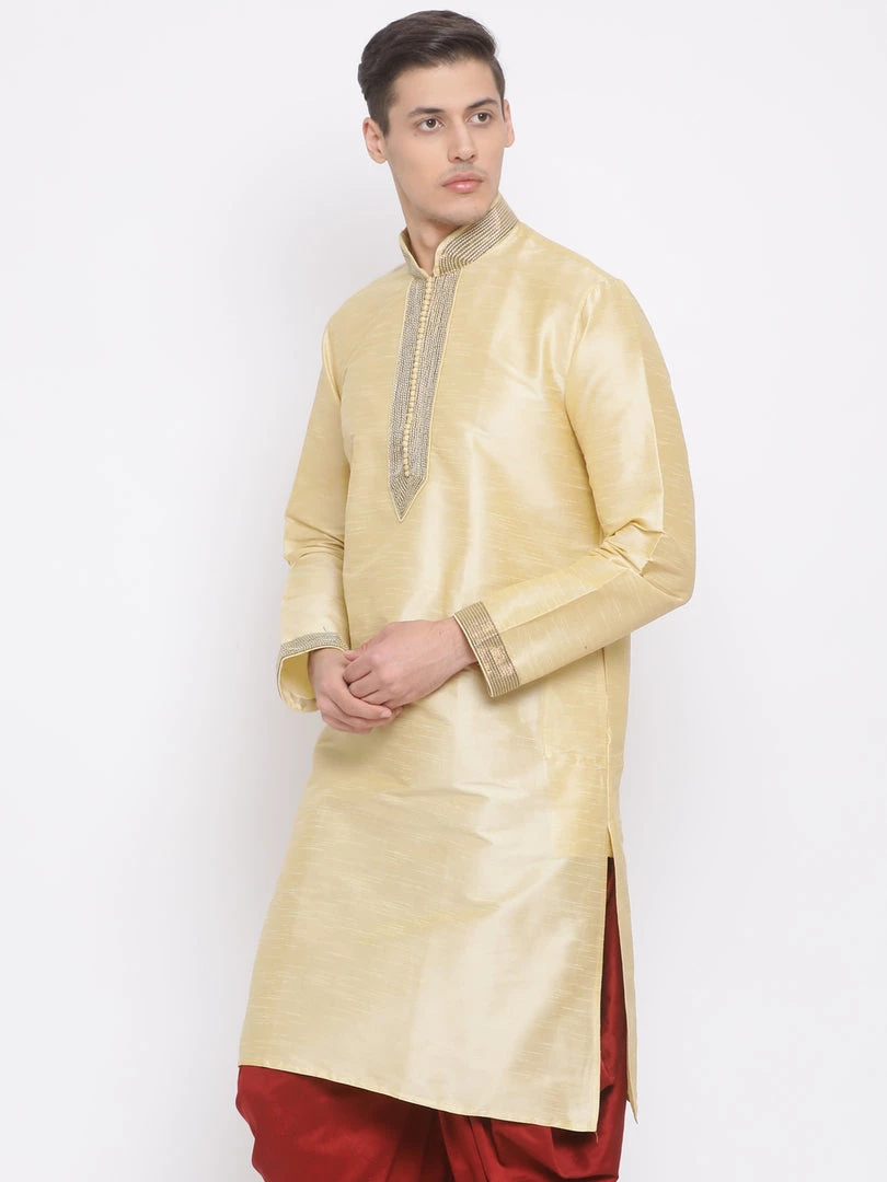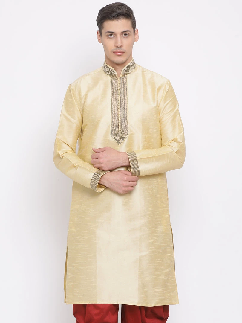 Golden solid knee length straight kurta, has a mandarin collar, long sleeves, button placket, embroidered detailings on sleeves and placket, straight hem and side slits