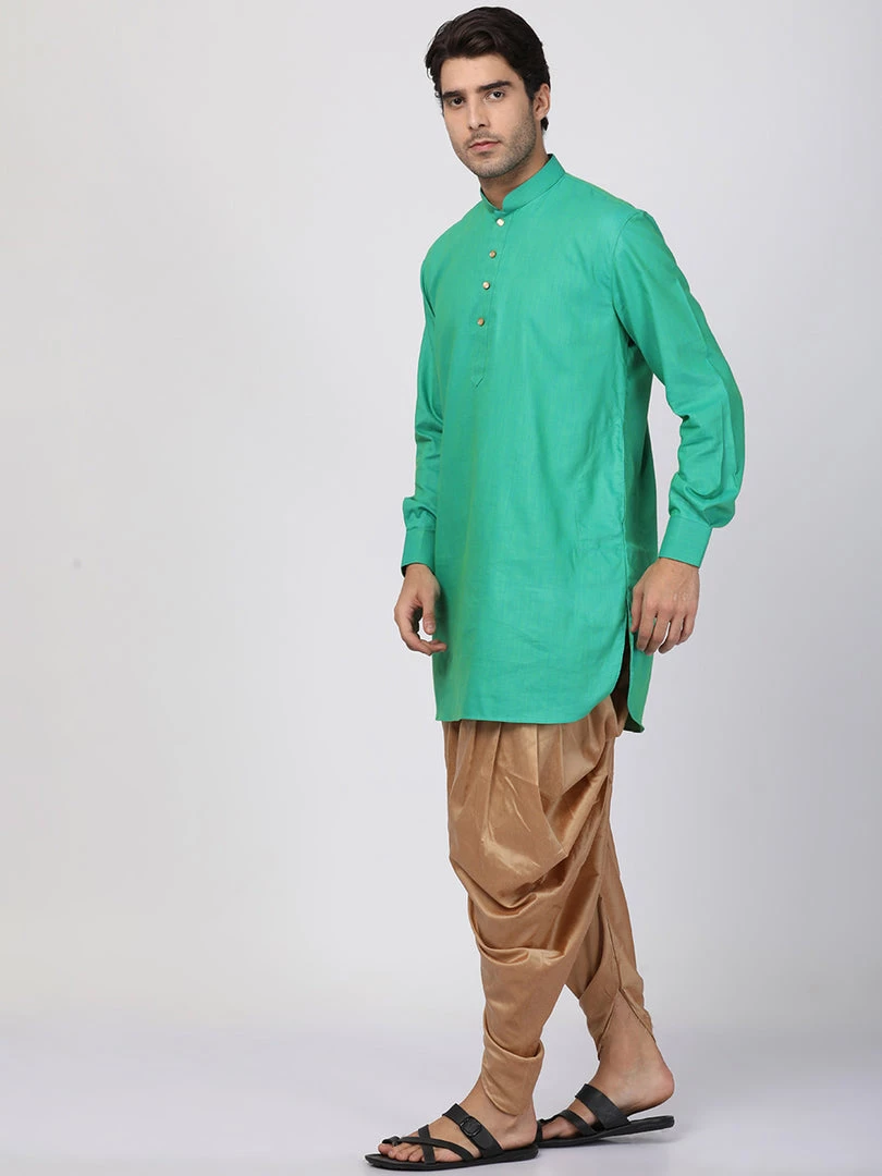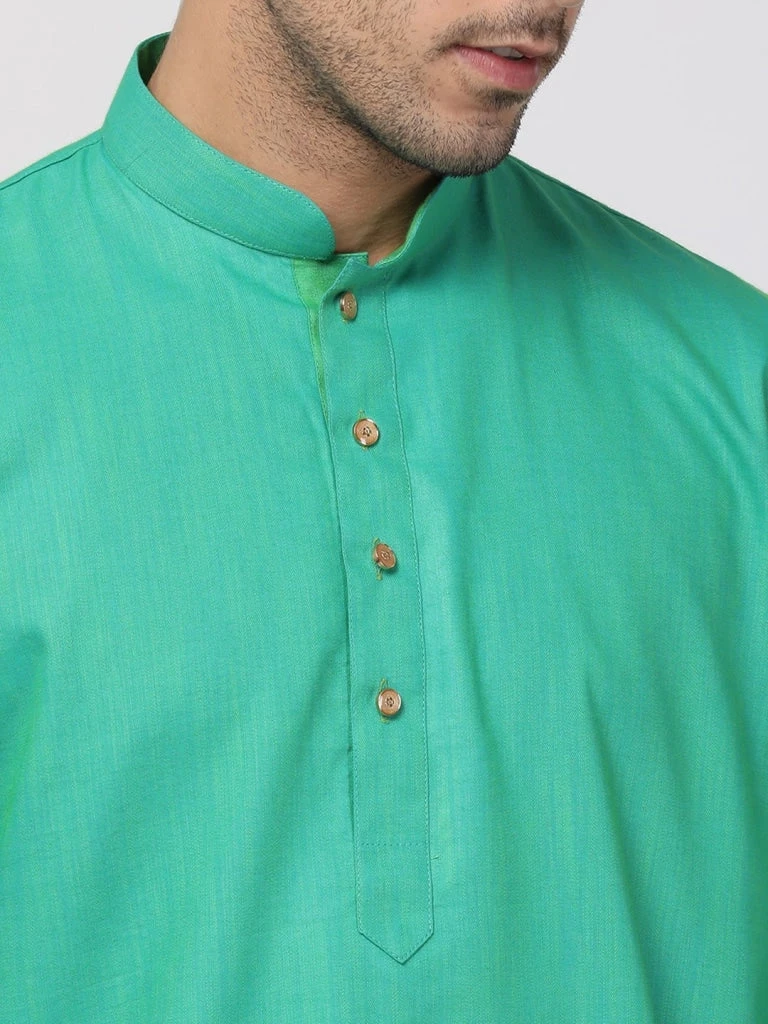 Green solid above knee length pathani kurta, has a mandarin collar, long sleeves, button placket, curved hem, side slits