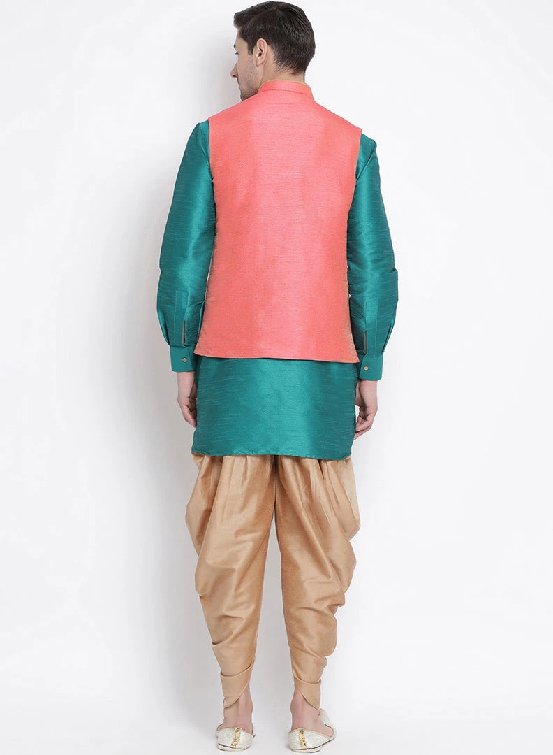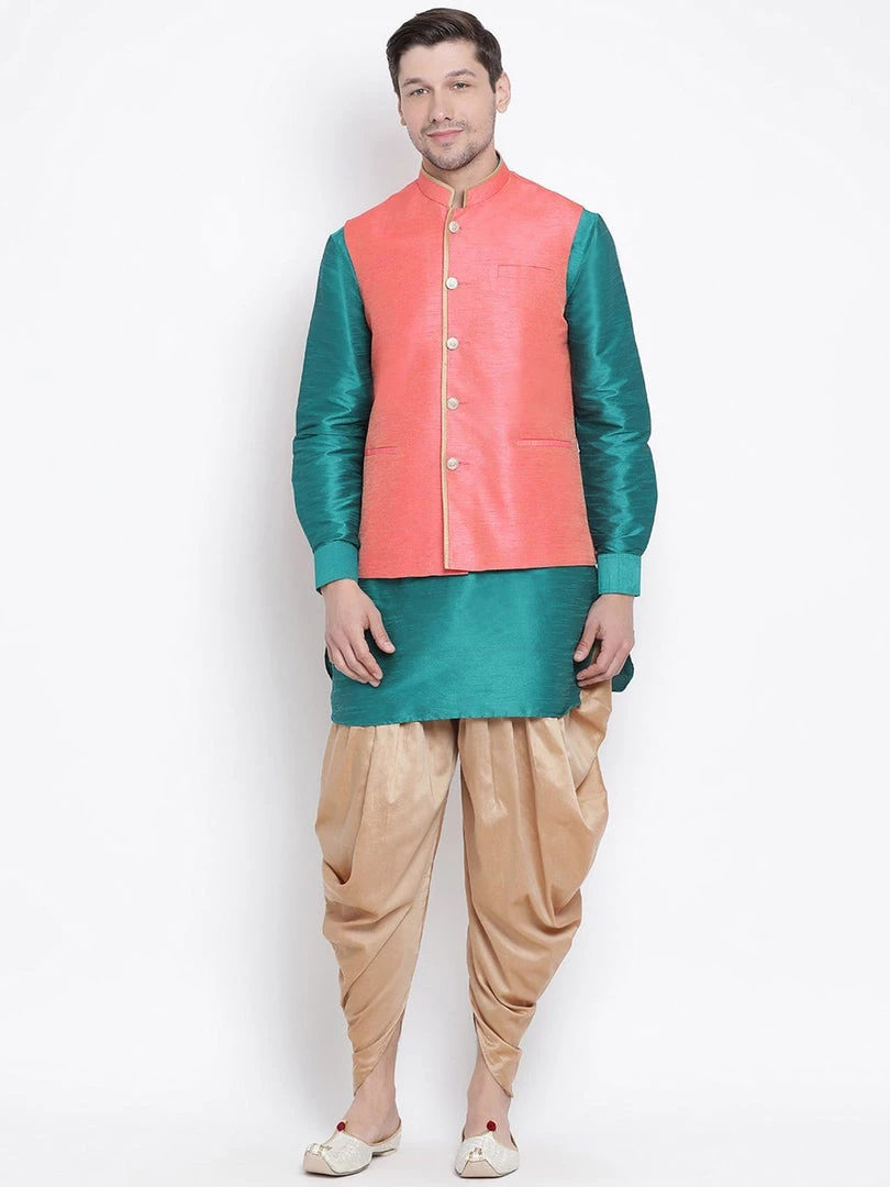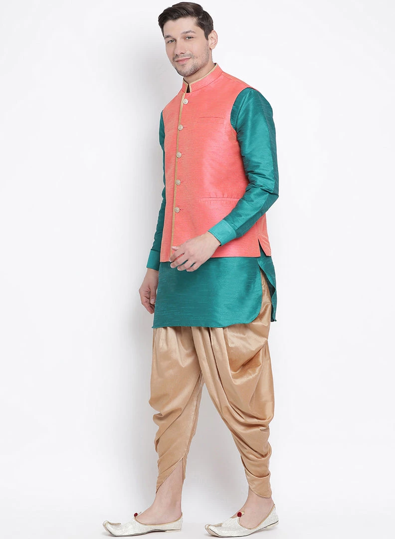 Green solid kurta with solid dhoti pant and pink Nehru jacket