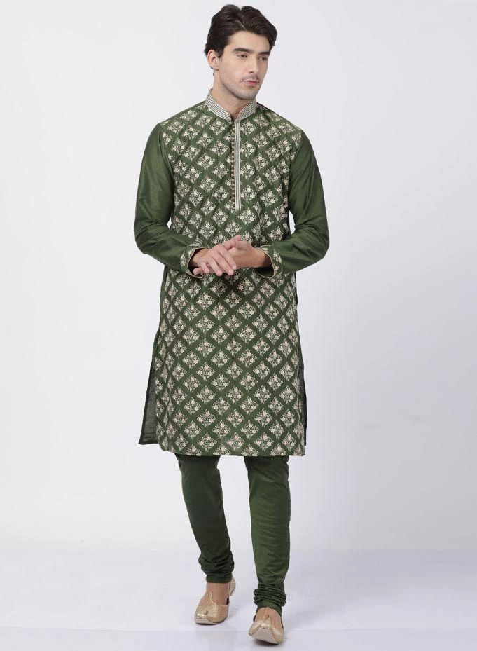 Green Woven Kurta, Long Sleeve, Straight hem, has a Mandarin Collar, Straight Knee-length, Side slits.