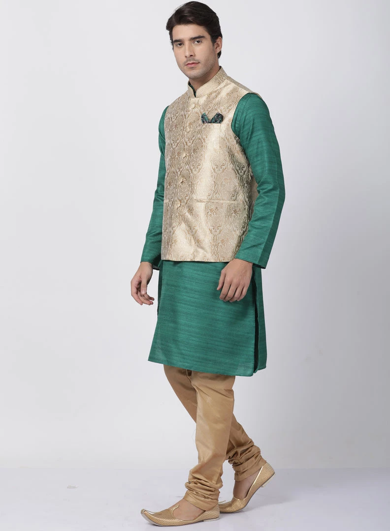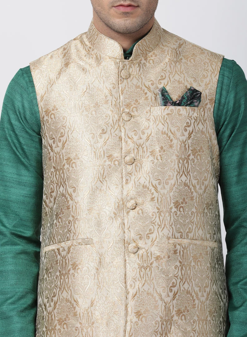 Green woven kurta with Gold solid Pyjama and beige Nehru jacket