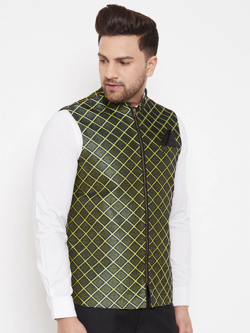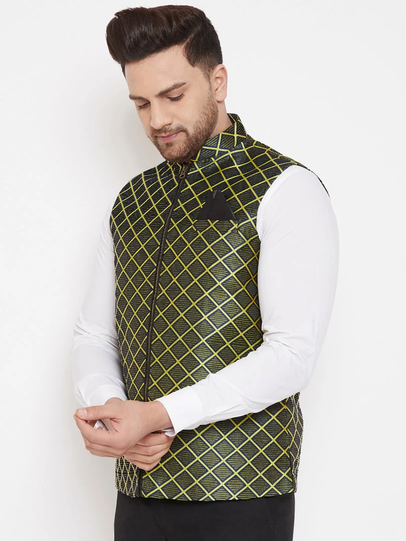 Green and black checked jute woven Nehru jacket, has a full zipper closure, regular length, mandarin collar, sleeveless, a welt pocket. Comes with pocket square.