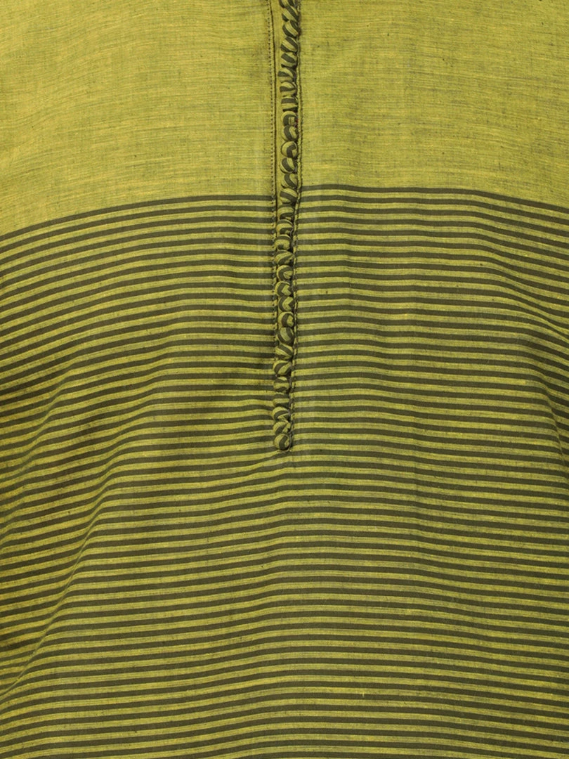 Green and mehndi color woven stripe straight above knee length kurta, has a mandarin collar, button placket, long sleeves, straight hem.
