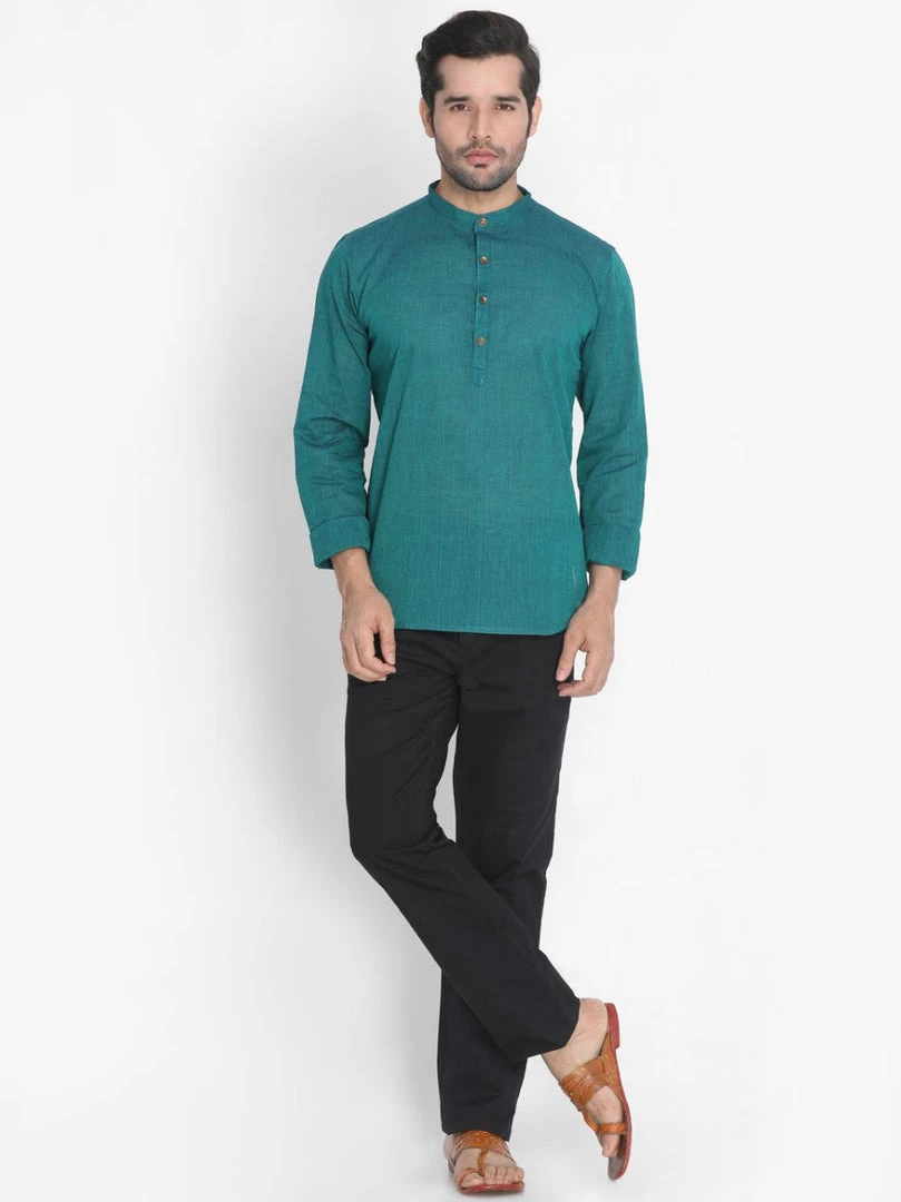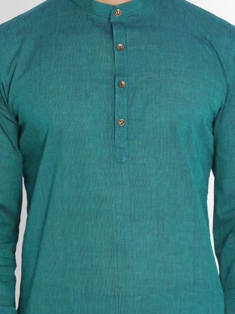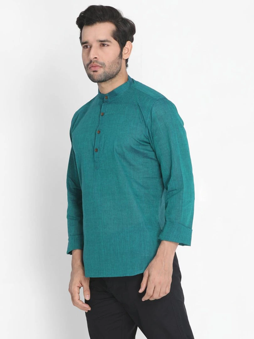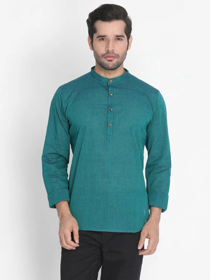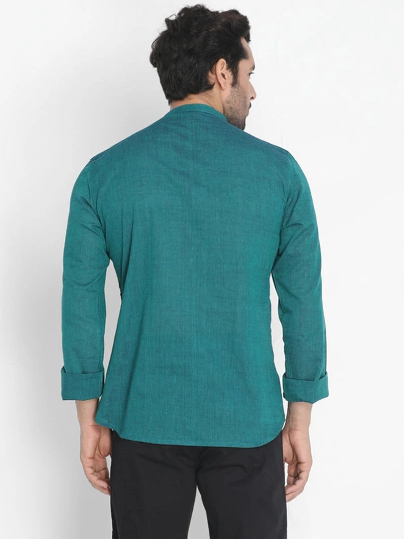 Green solid kurta, has a mandarin collar, long sleeves, straight hem, button placket
