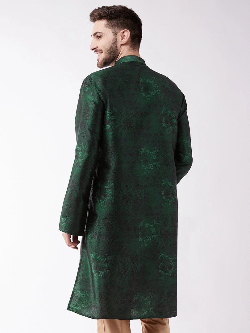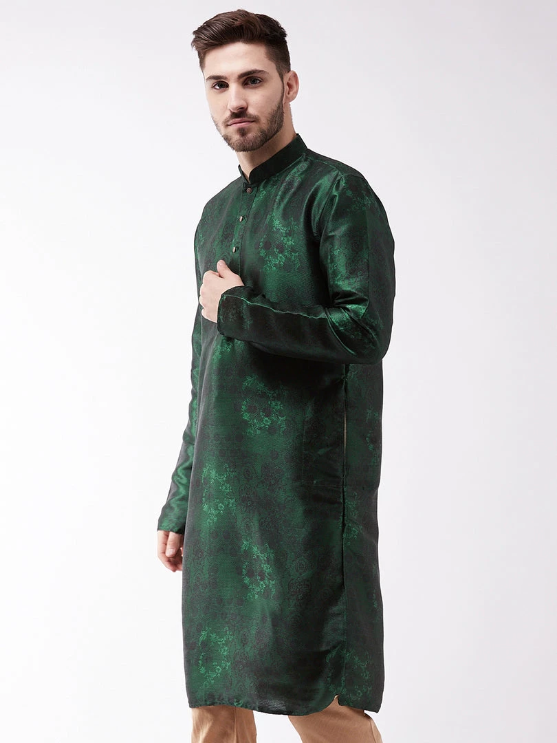 Green jacquard straight knee-length kurta, has a mandarin collar, button placket, long sleeves, a straight hem, and side slits.