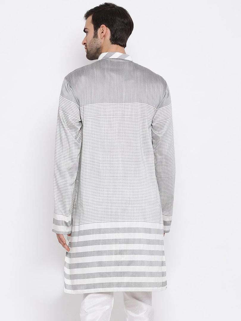 Grey and White striped straight kurta, has a mandarin collar, long sleeves, button placket, straight hem, and side slits.