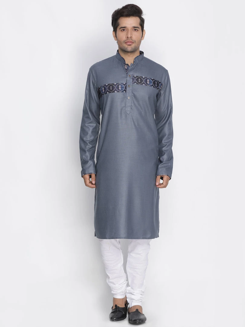 Grey solid straight kurta, has a mandarin collar, long sleeves, woven strip attached with yoke part, button placket, straight hem, and side slits