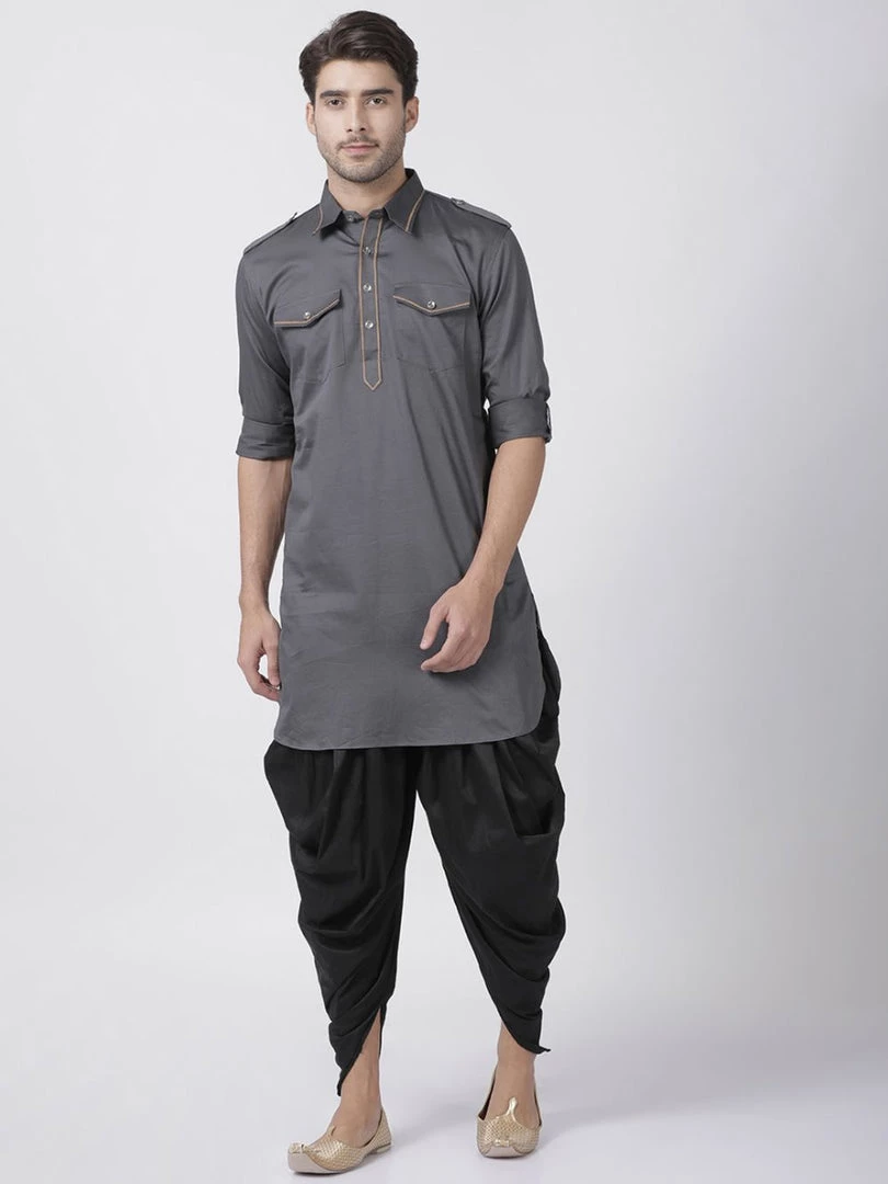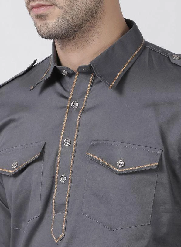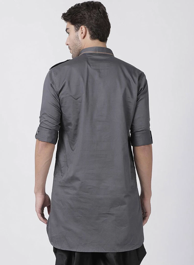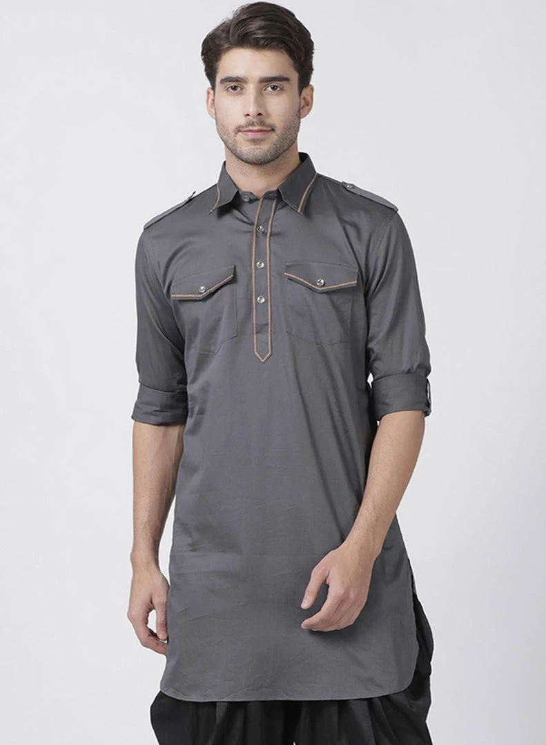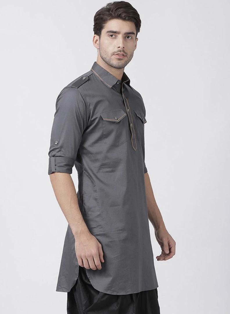 Grey straight above knee length pathani kurta, has a shirt collar, long sleeves, button placket, curved hem, two pockets and side slits