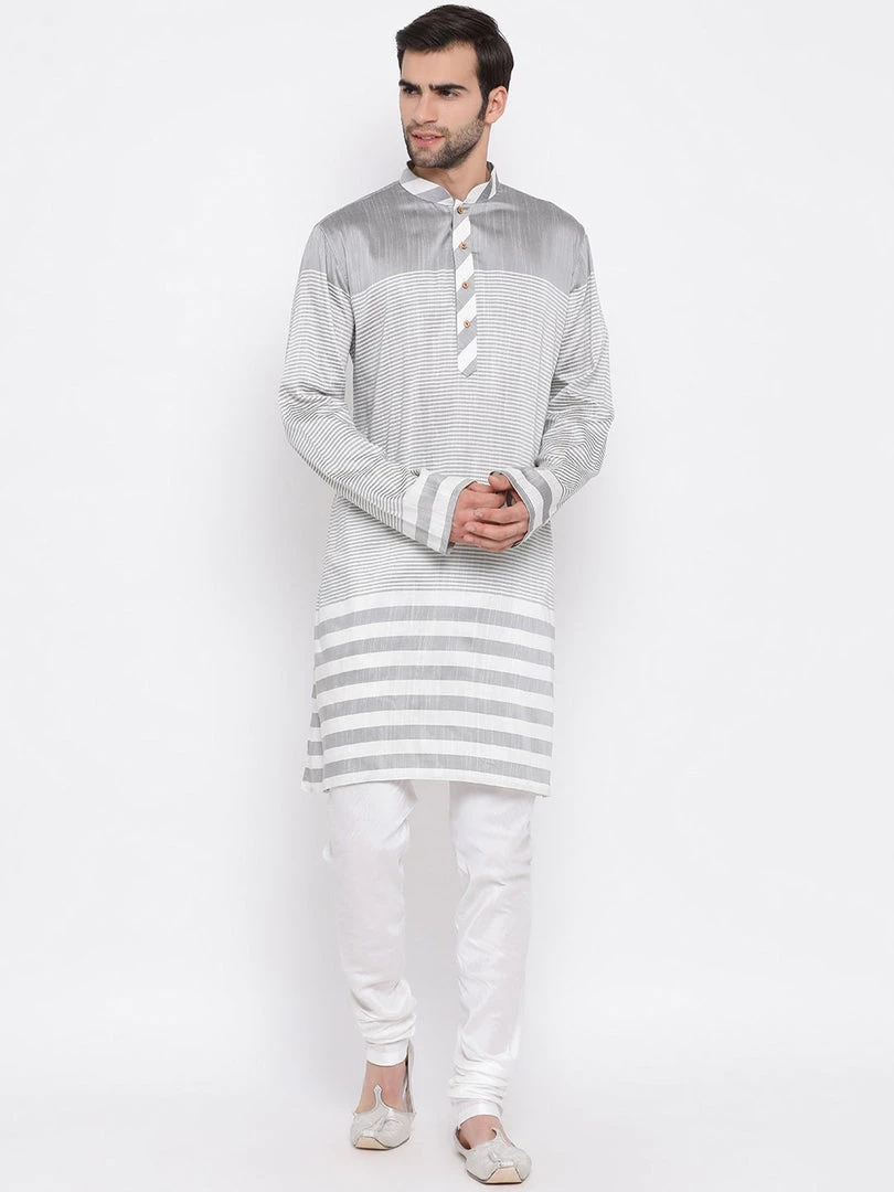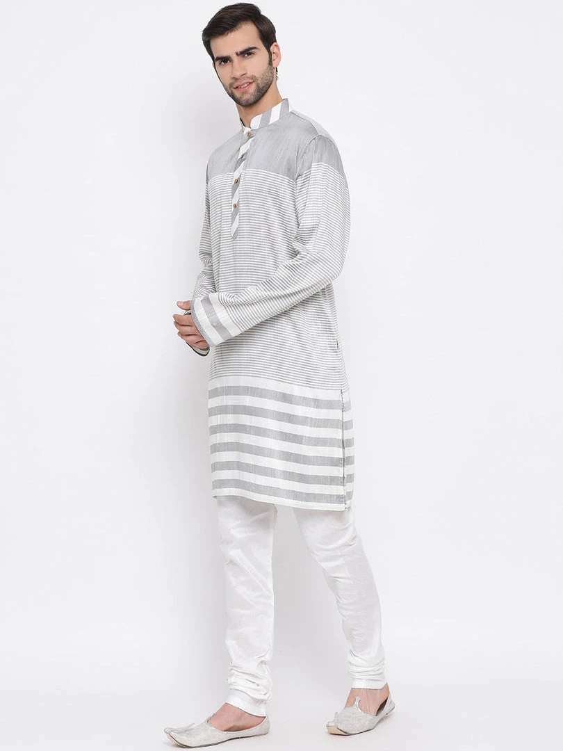 Grey and white stripe woven kurta with solid churidar.
