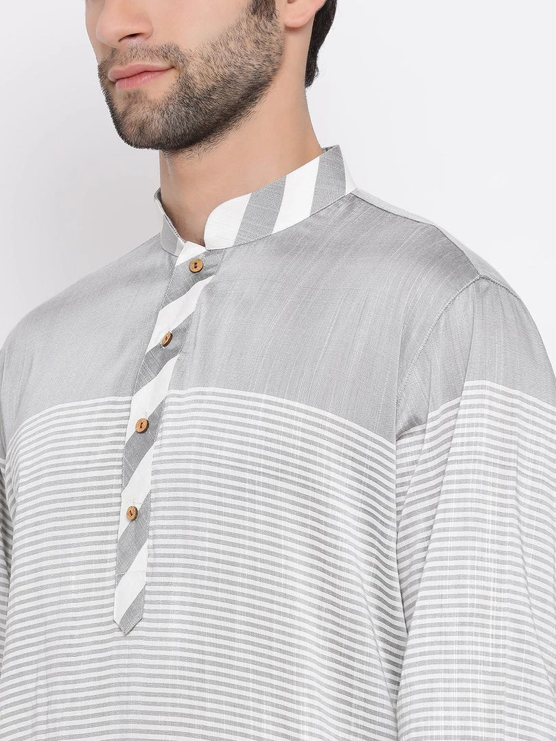 Grey and white stripe straight knee length kurta, has a mandarin collar, button placket, long sleeves, straight hem.