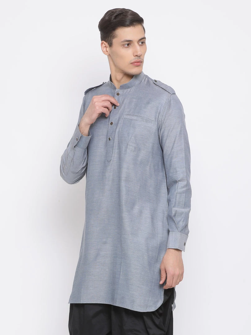 Grey short straight kurta, has a mandarin collar, long sleeves, button placket, curved hem, a pocket, and side slits