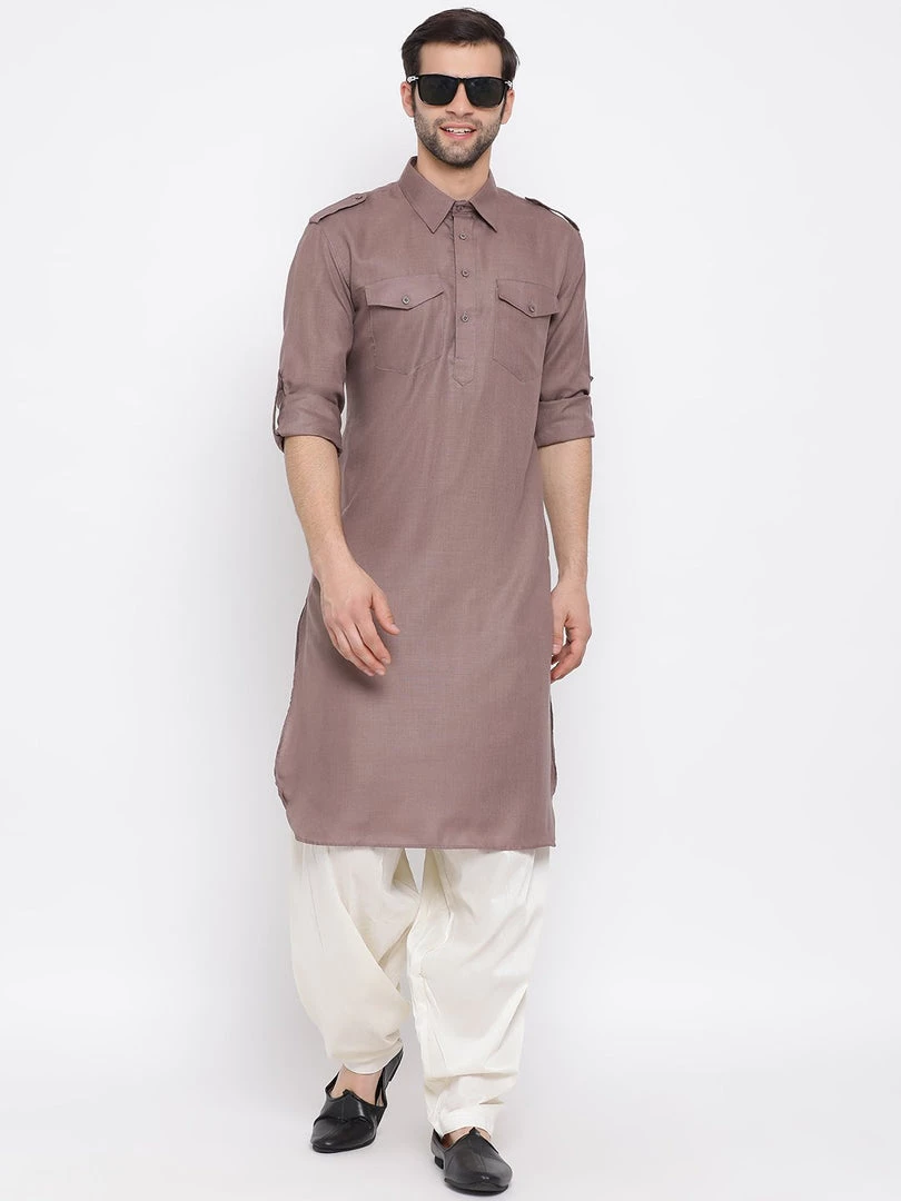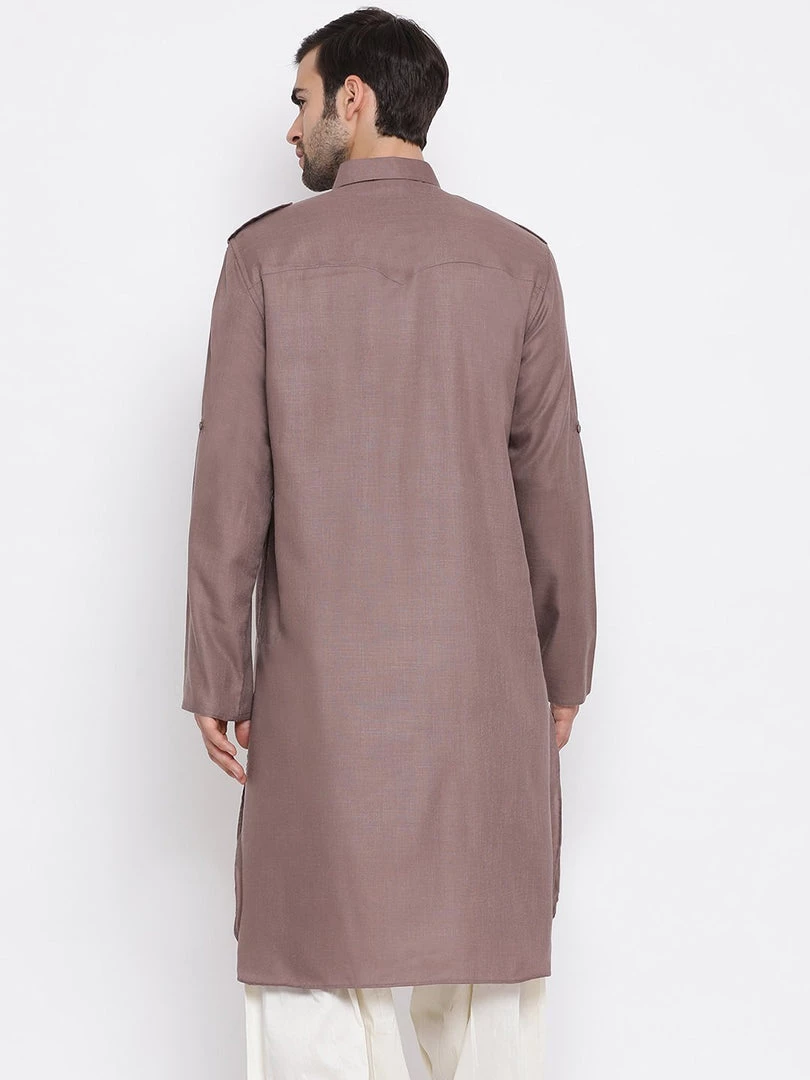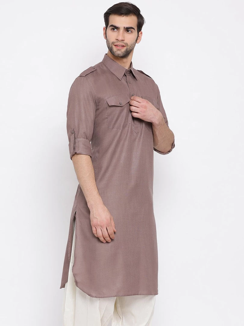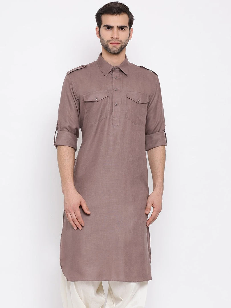 Grey straight knee length pathani kurta, has a shirt collar, long sleeves, button placket, curved hem, two pockets and side slits