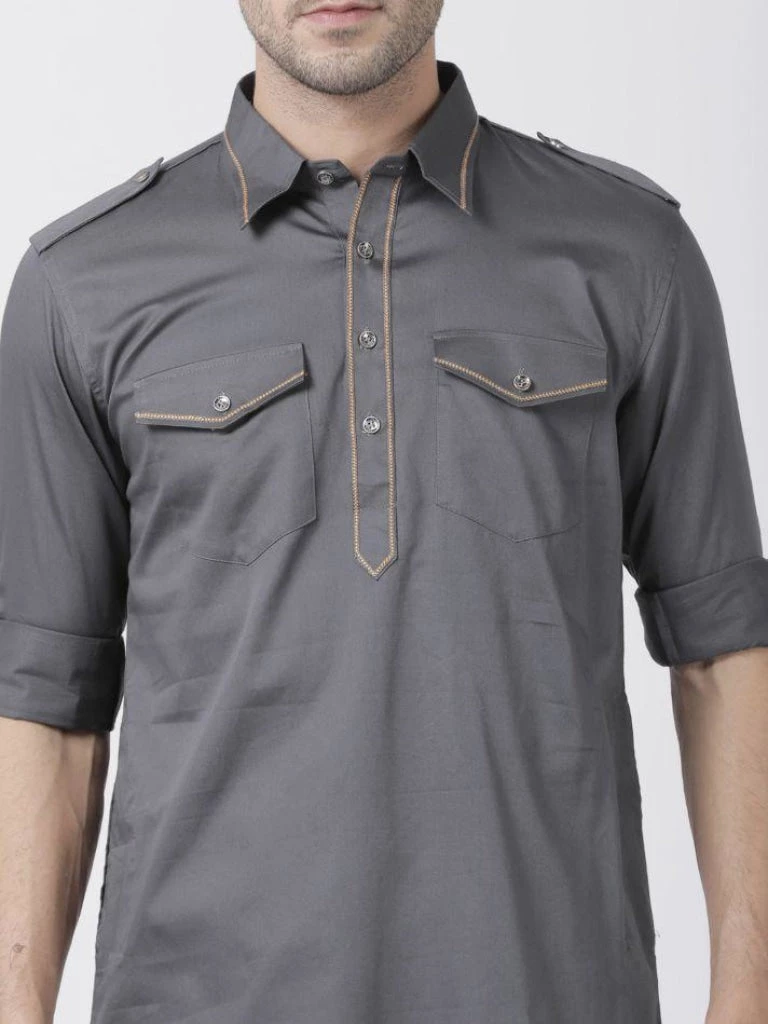 Grey solid straight above knee length kurta, has a shirt collar, button placket, long sleeves, two pockets and curved hem