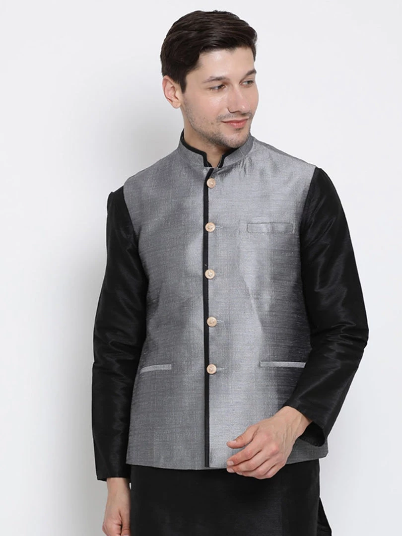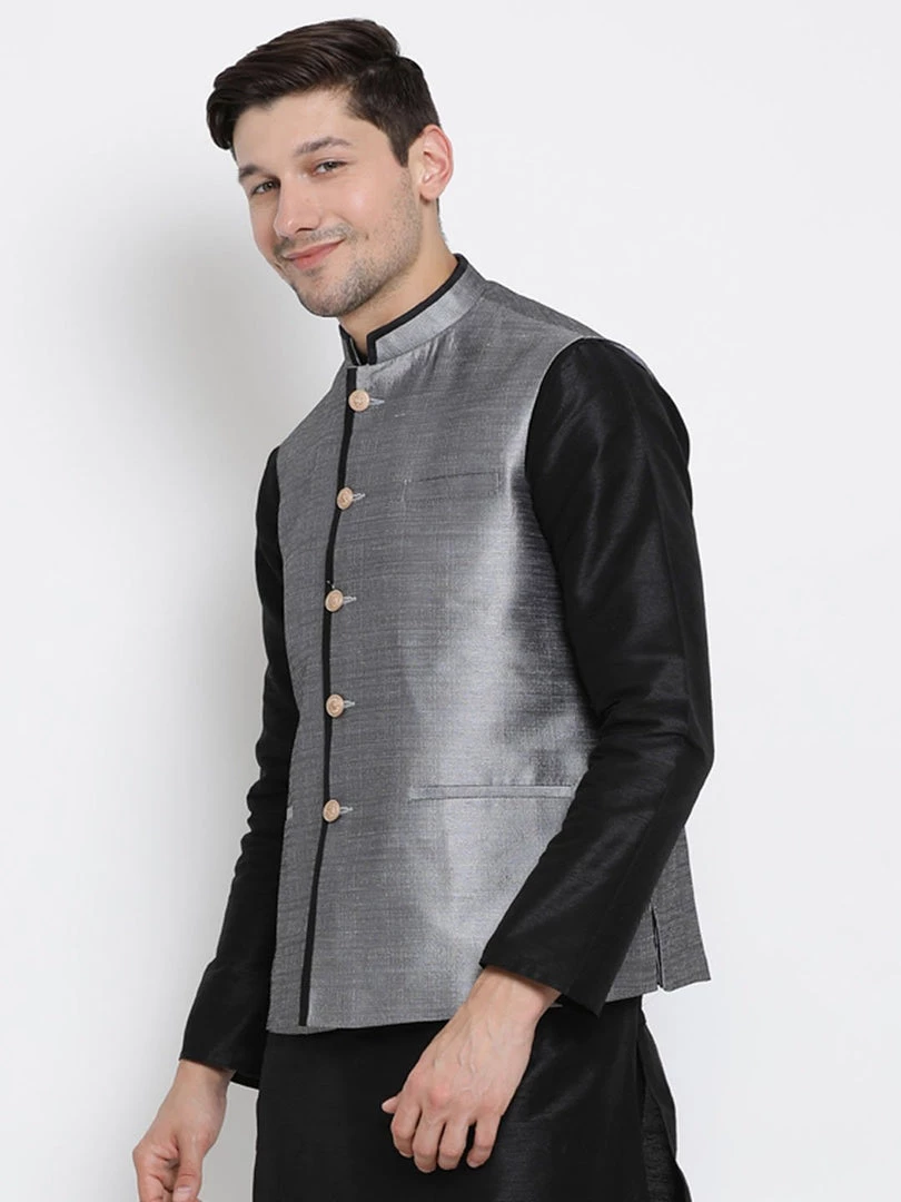 Grey solid Nehru jacket, has a mandarin collar, a full button placket, sleeveless, three welt pockets