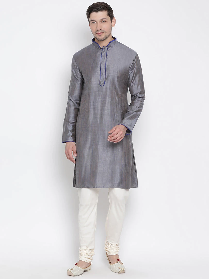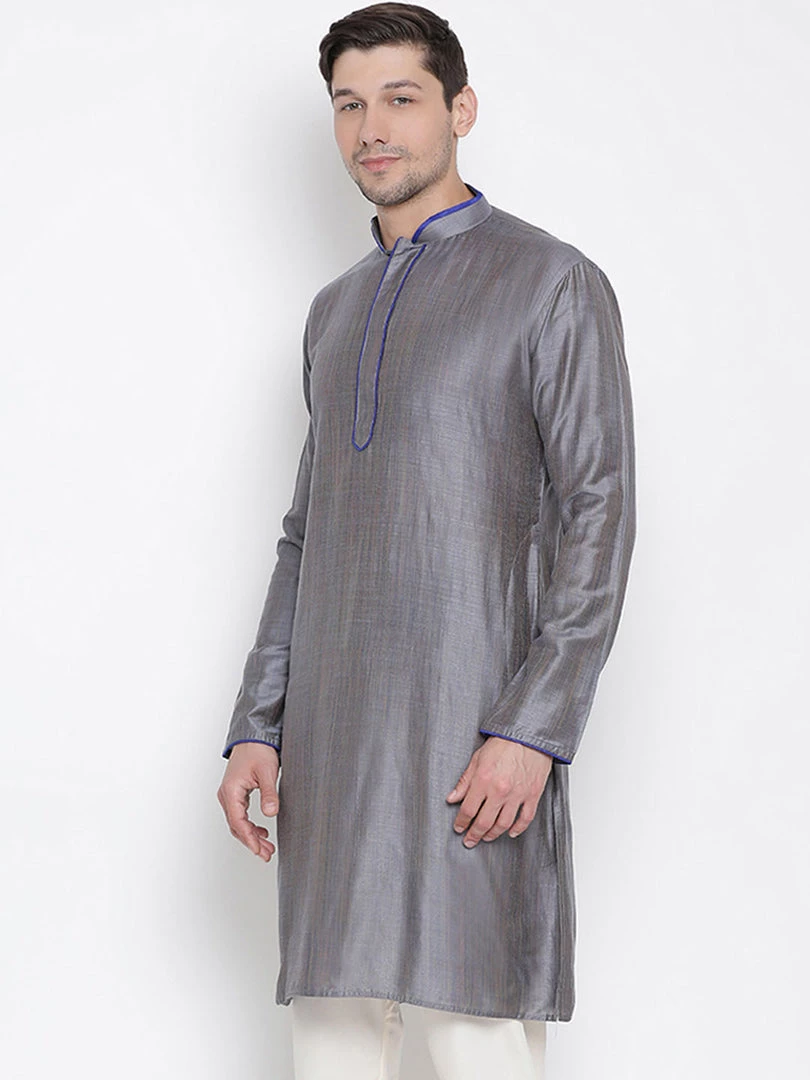Grey straight kurta, has a mandarin collar, long sleeves, button placket, straight hem, and side slits