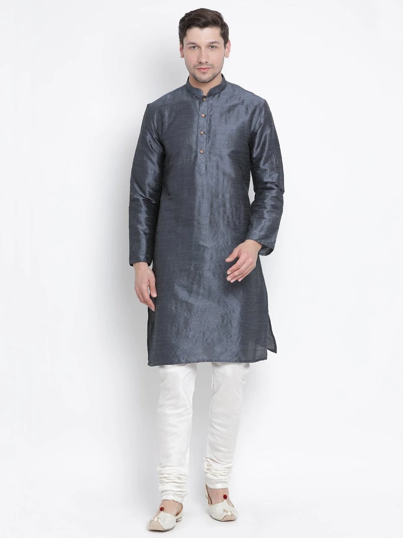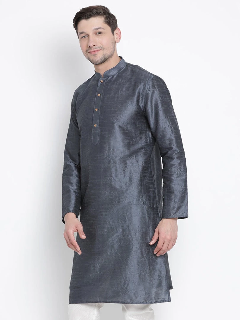 Grey solid straight kurta, has a mandarin collar, long sleeves, straight hem, and side slits