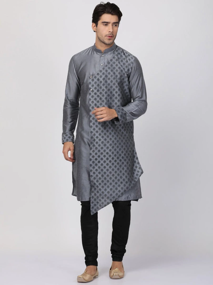 Grey printed layered straight knee-length kurta, has a mandarin collar, button placket, long sleeves, asymmetric hem.