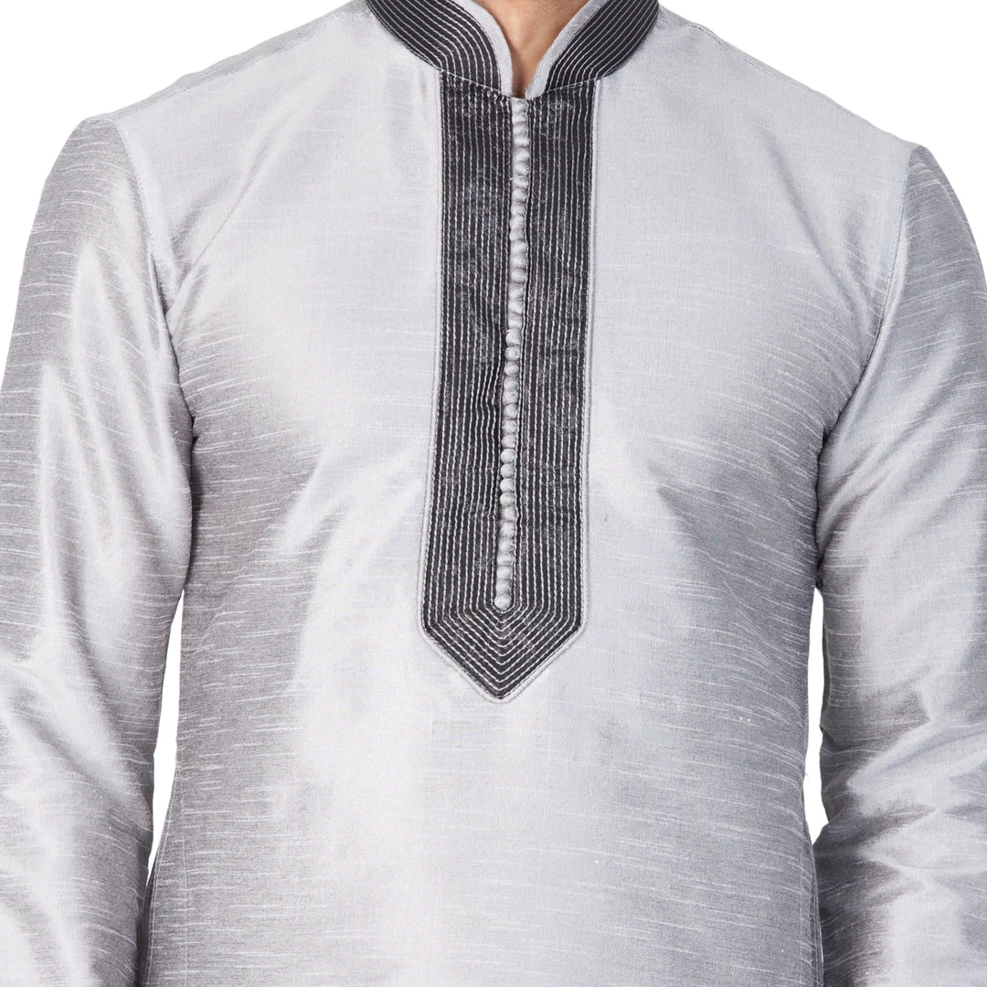 Grey straight knee length kurta, has a mandarin collar, long sleeves, embroidered details on collar, button placket, straight hem