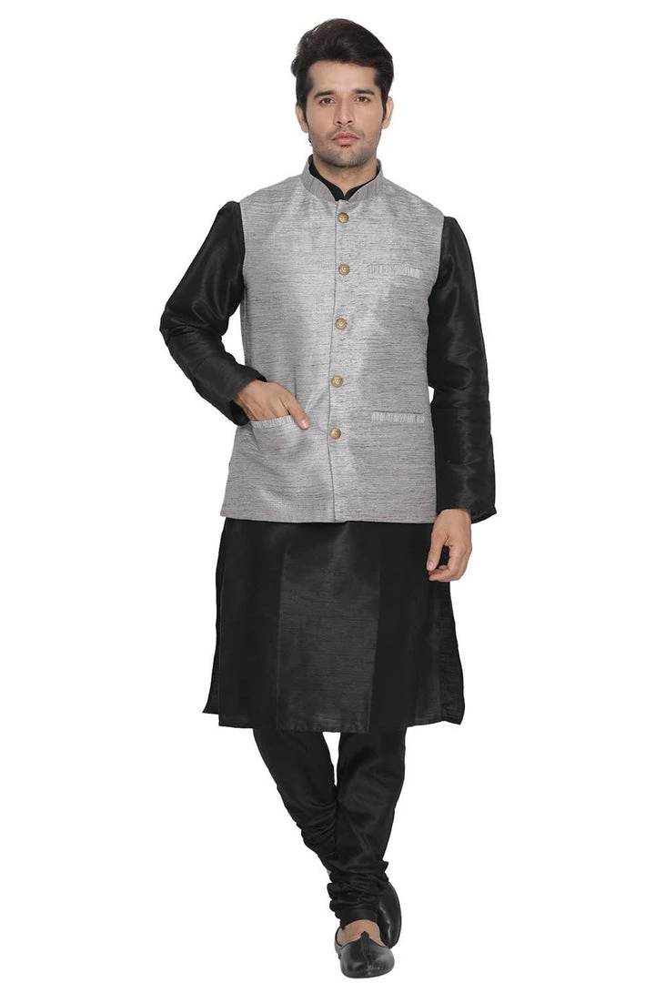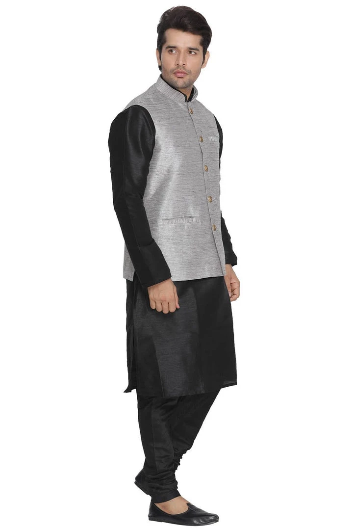 Black solid kurta with solid churidar and grey Nehru jacket
