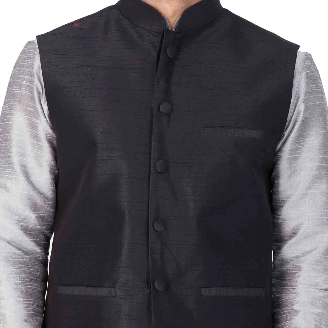 Black solid Nehru jacket, has a mandarin collar, sleeveless, a full button placket, three pockets