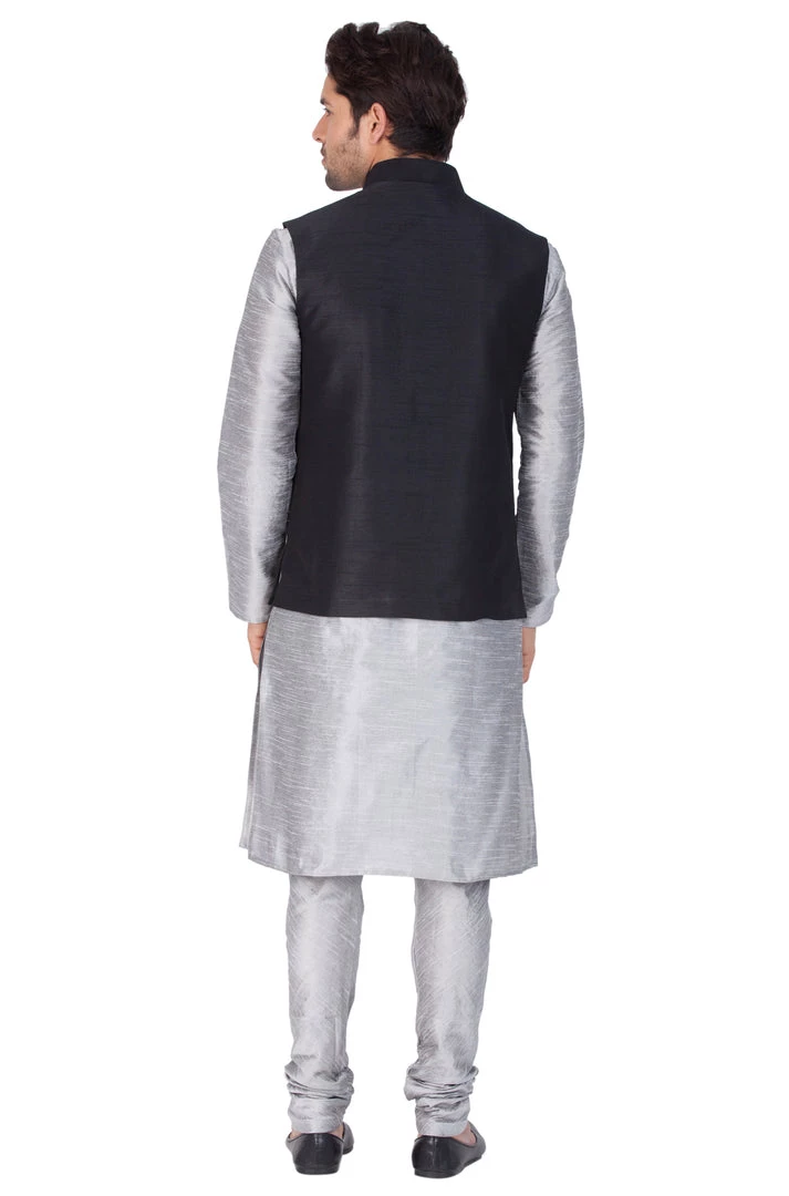 Grey solid kurta with solid churidar and black Nehru jacket