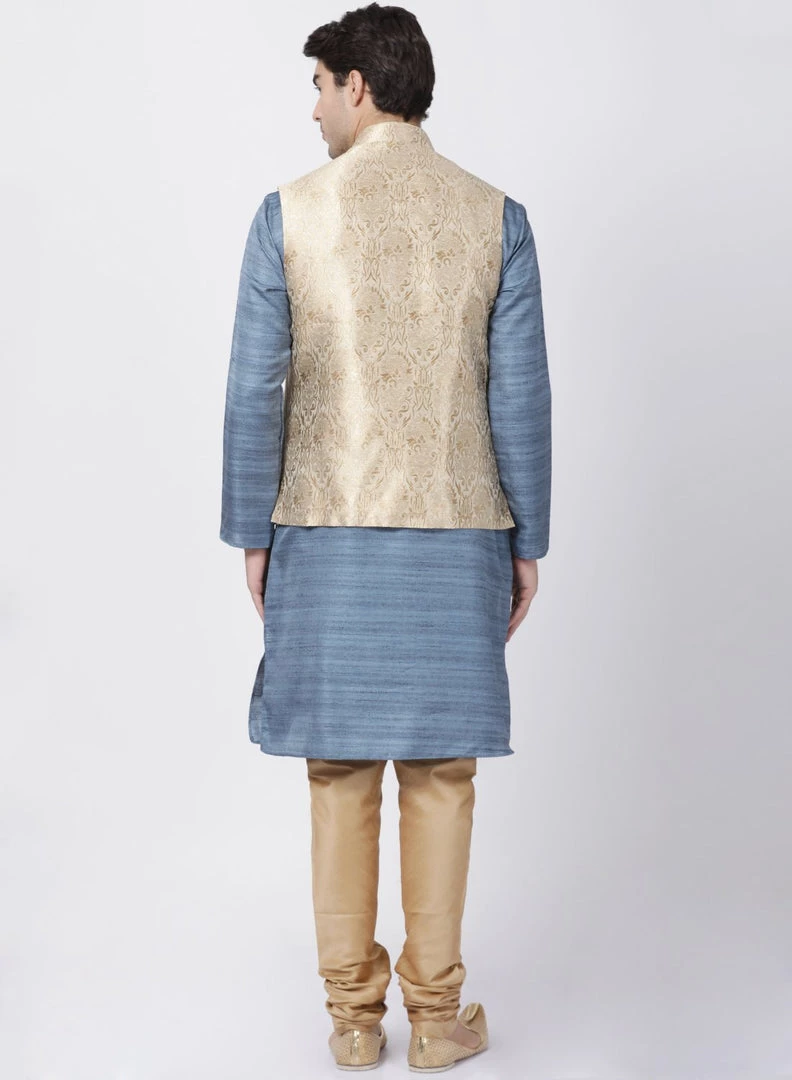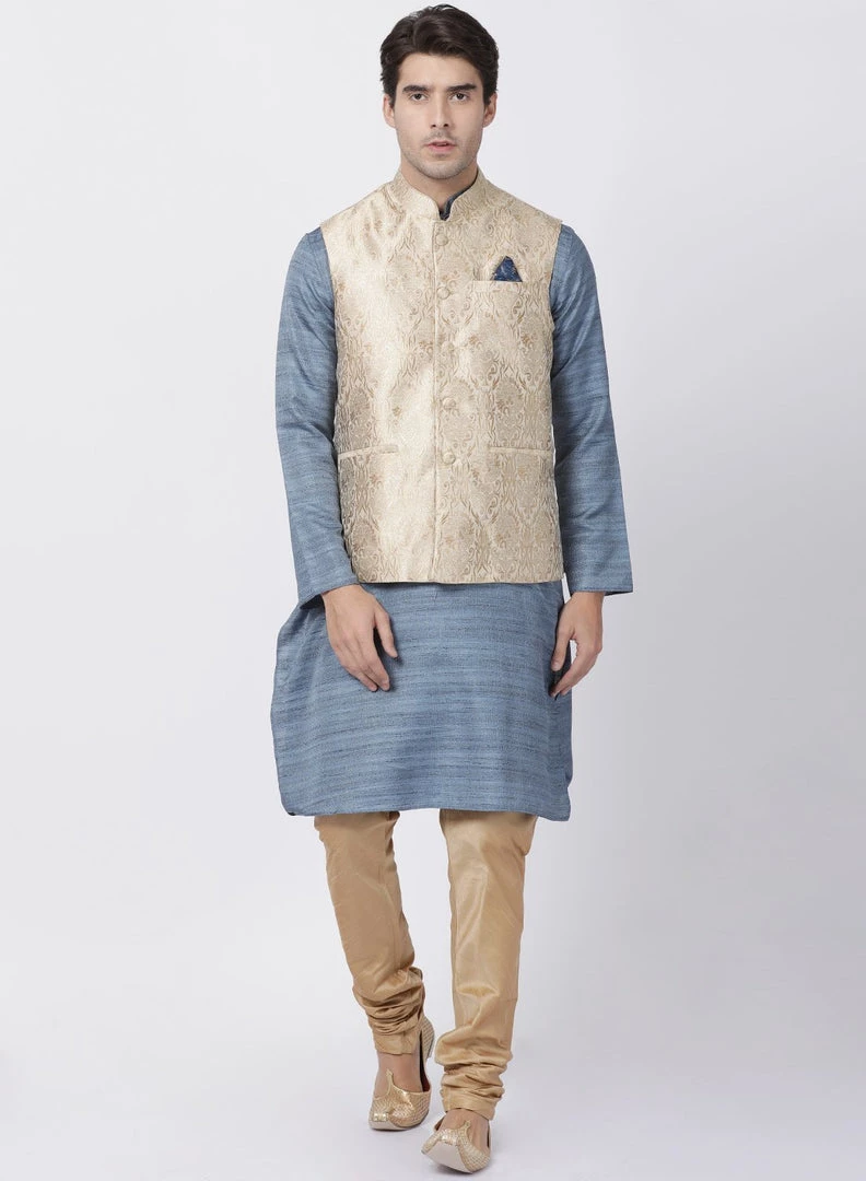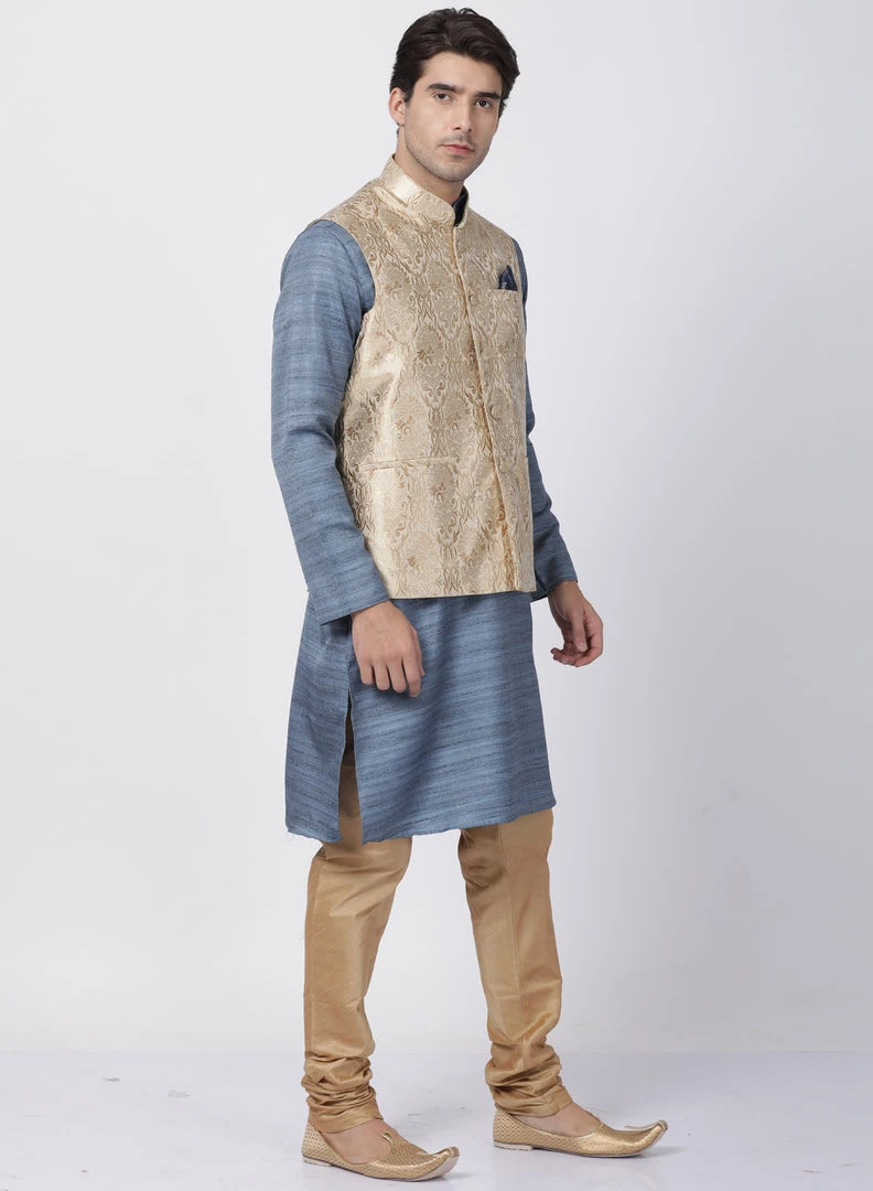 Grey woven kurta with solid Pyjama and beige Nehru jacket