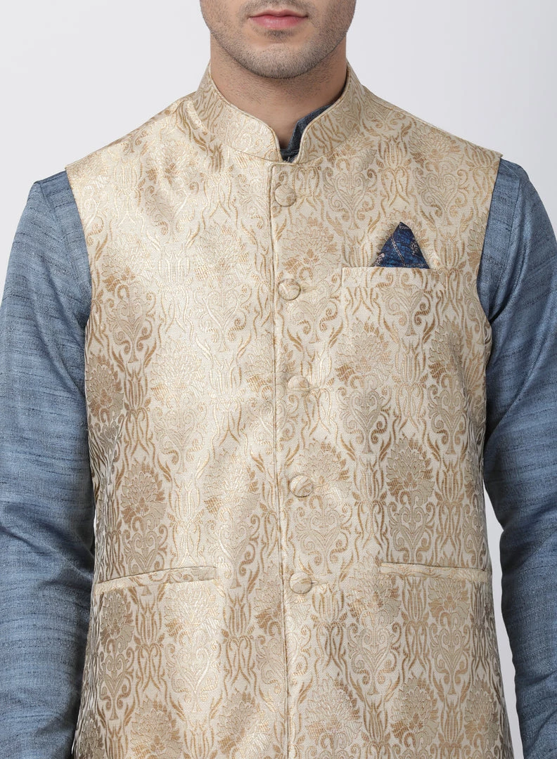Beige and gold-toned woven Nehru jacket, has a mandarin collar, a full button placket, sleeveless, three welt pocket one with a pocket square.
