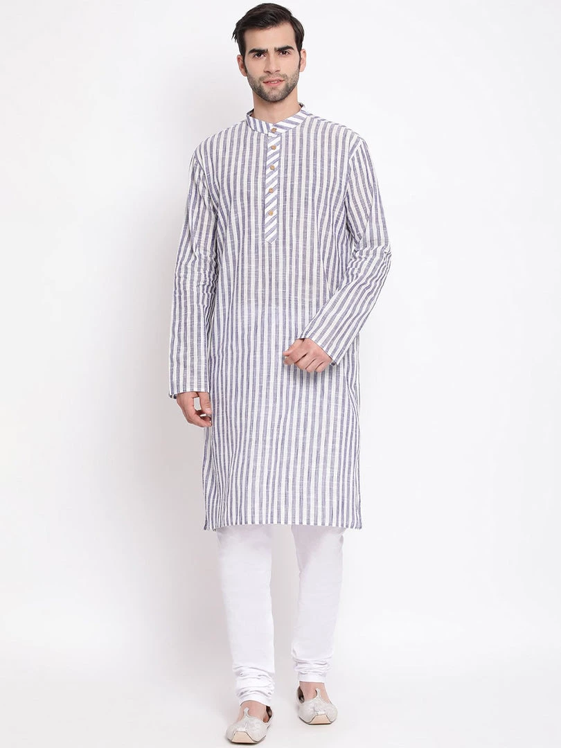 Grey and white stripe woven straight knee length kurta, has a mandarin collar, long sleeves, button placket, straight hem.