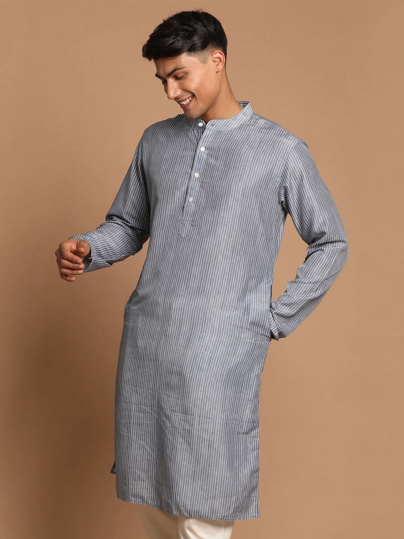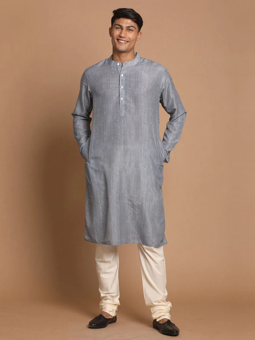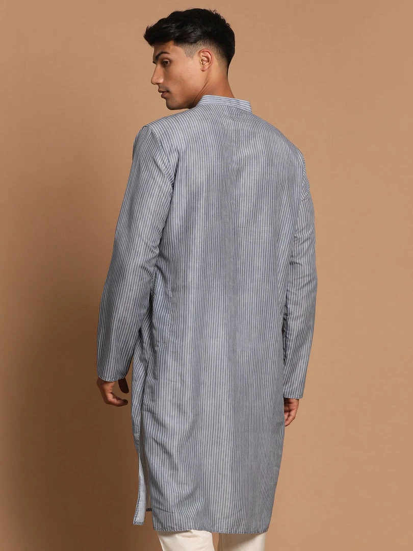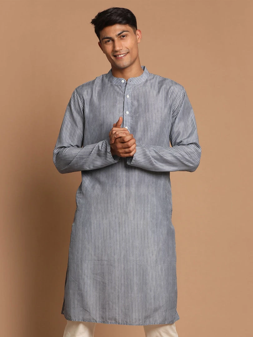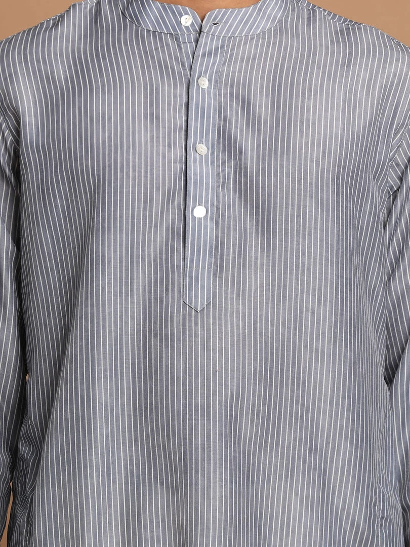 Grey cotton blend stiped kurta , has a mandarin collar, knee length, long sleeves, a straight hem, and side slits.