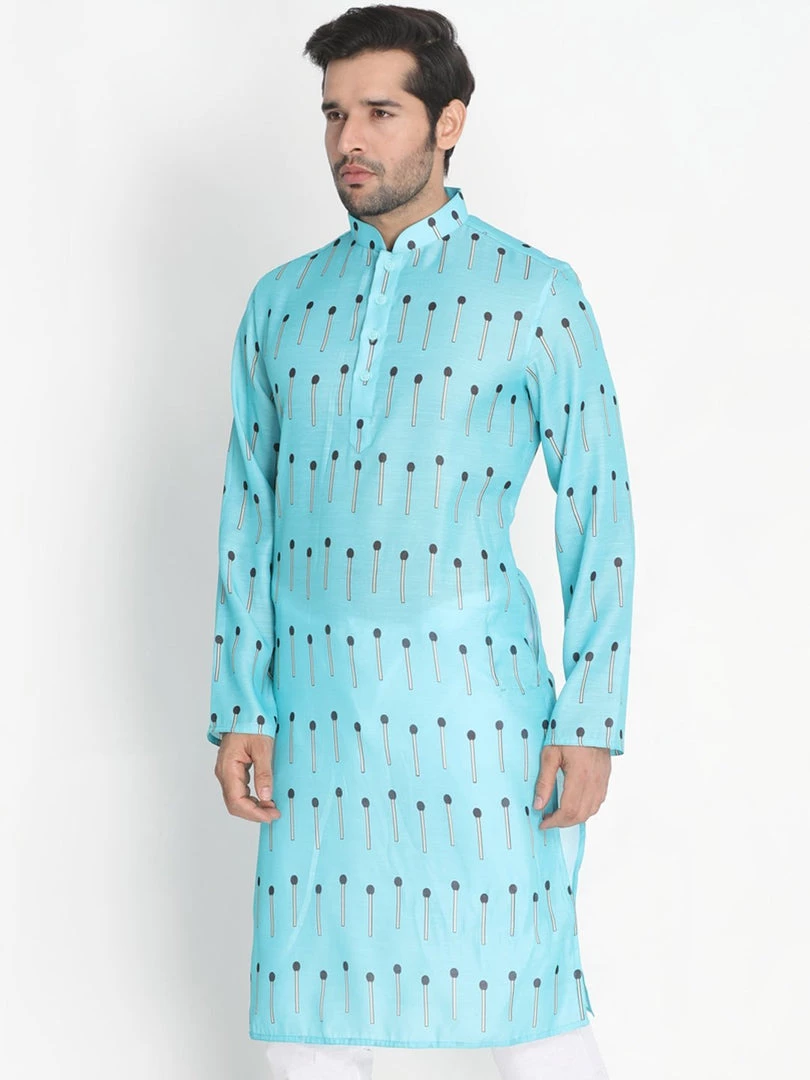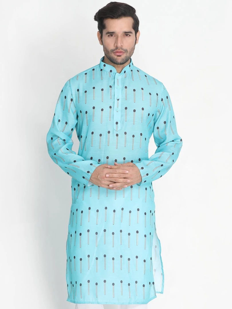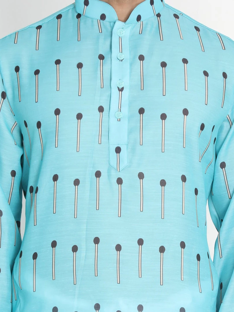 Light blue match stick printed straight knee length kurta, has a mandarin collar, button placket, long sleeves, straight hem.