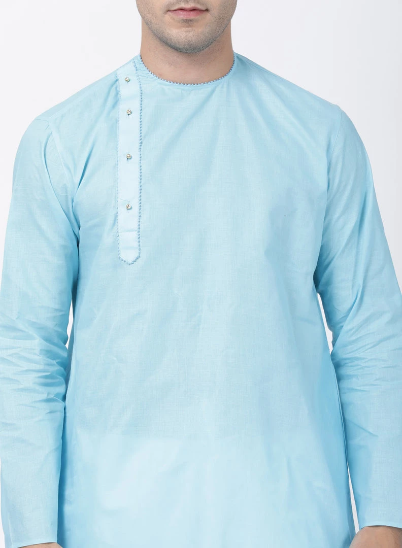 Light blue solid straight knee length kurta, has a round neck, side button placket, long sleeves, straight hem