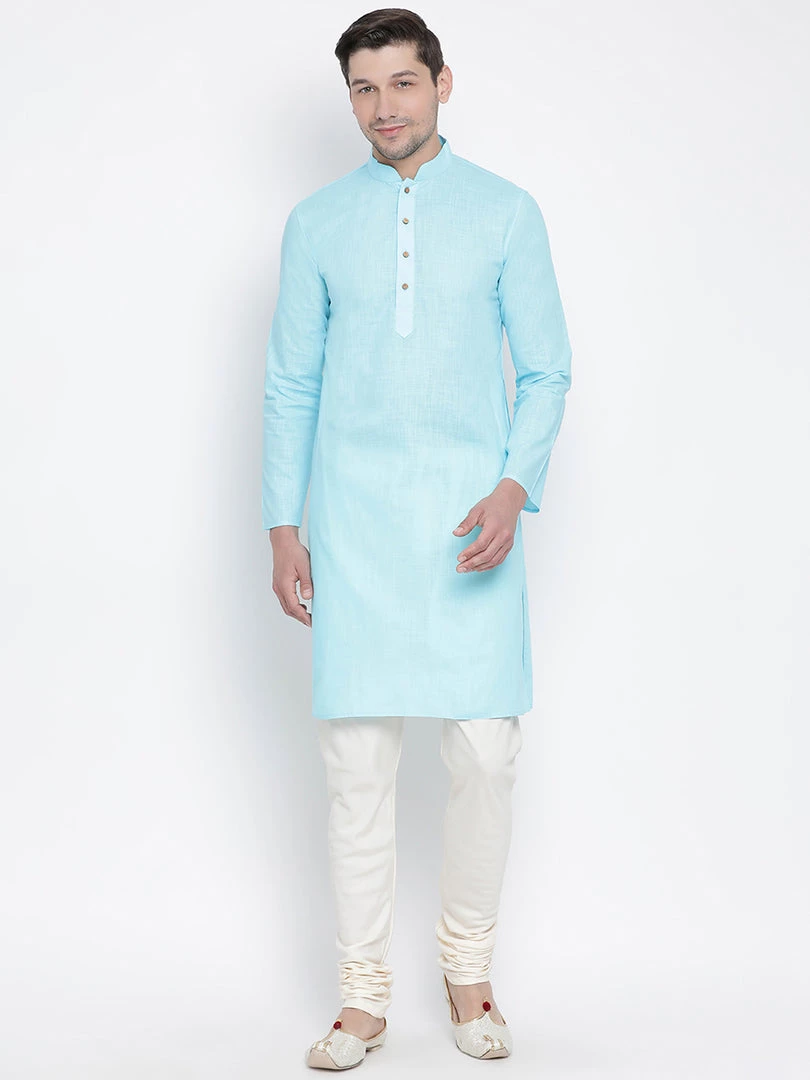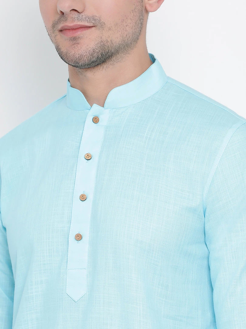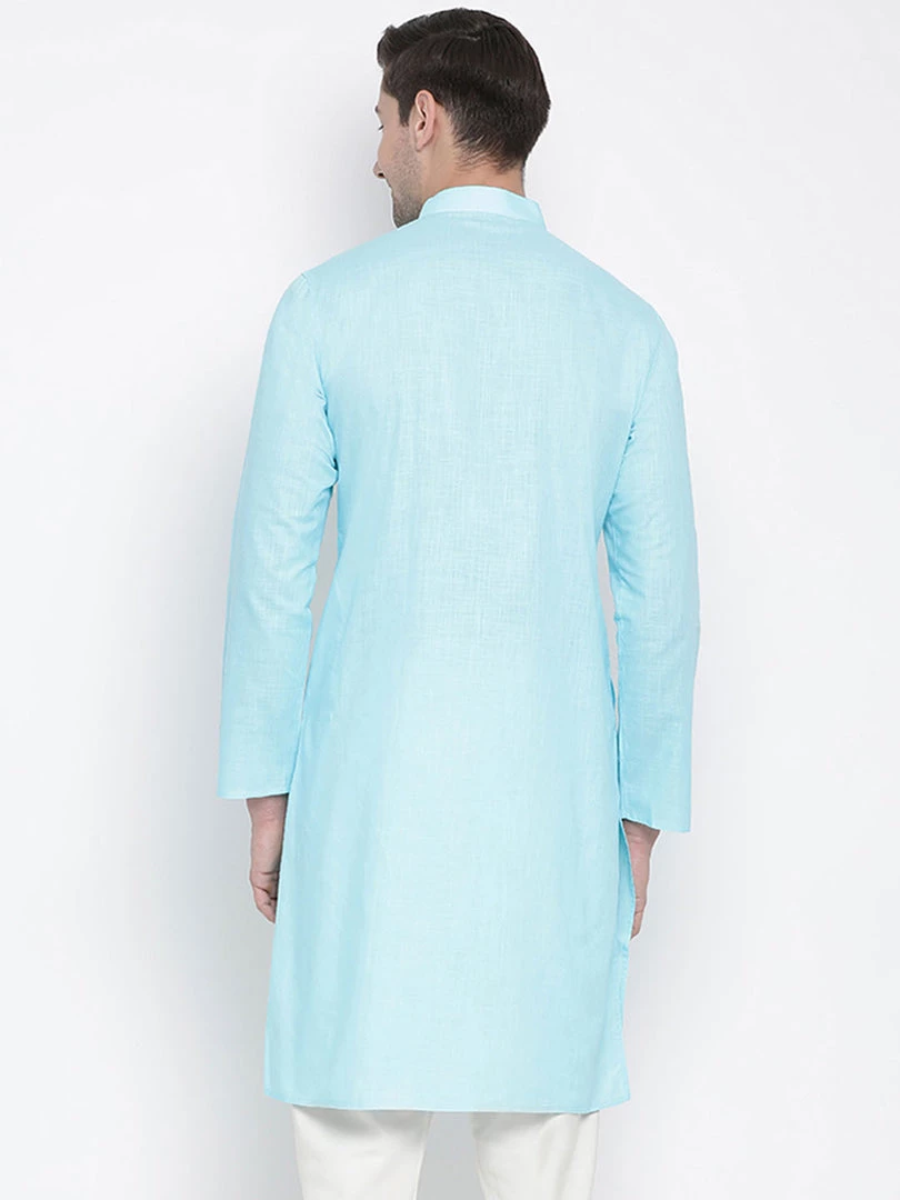 Light blue solid straight kurta, has a mandarin collar, long sleeves, straight hem, and side slits