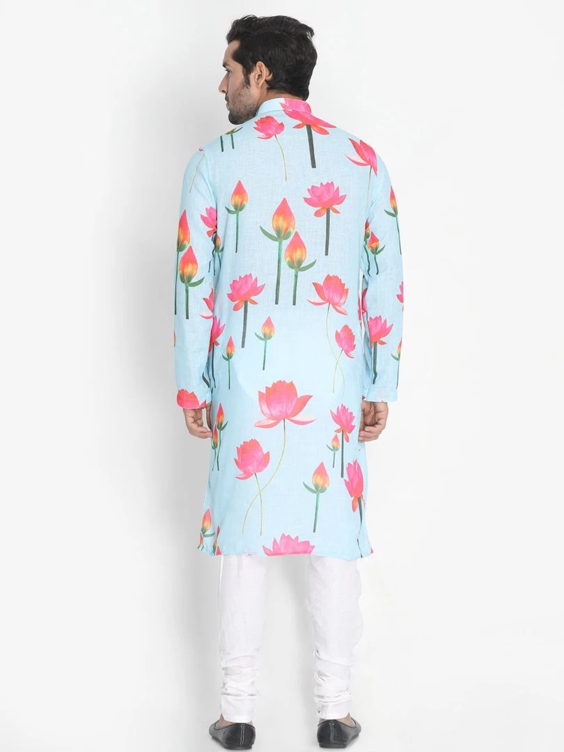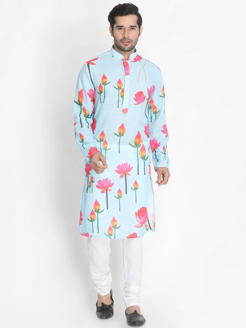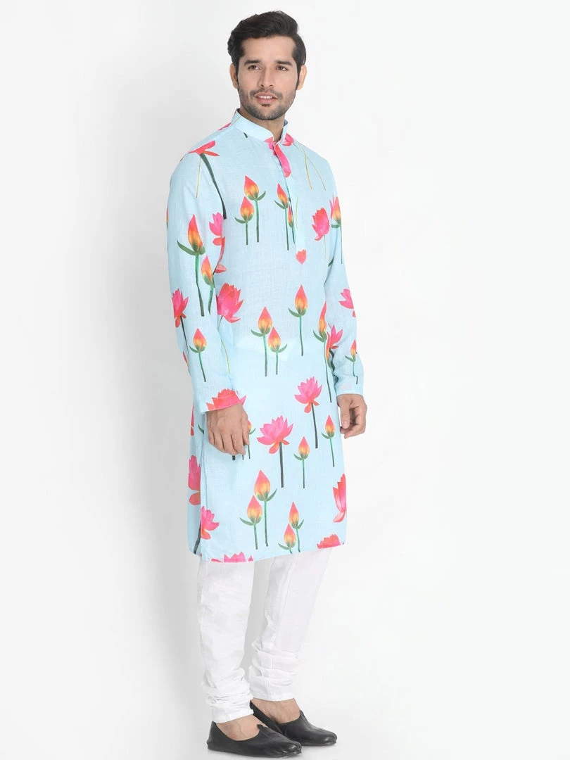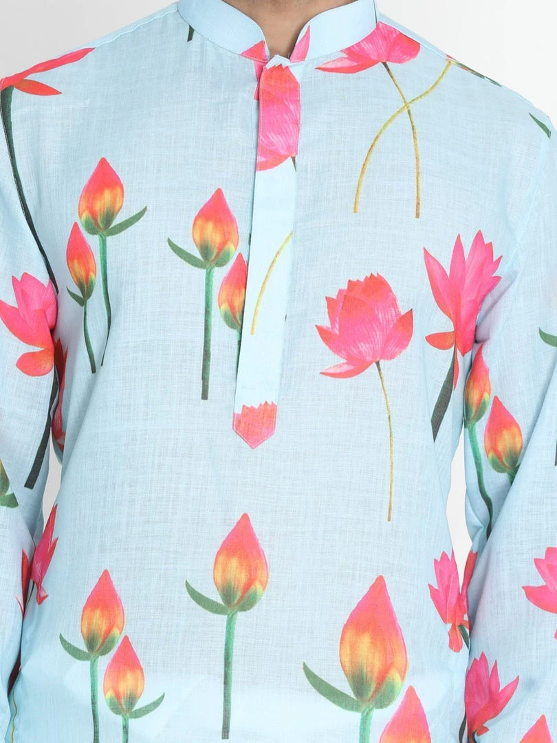 Light blue and pink floral printed straight knee-length kurta, has a mandarin collar, button placket, long sleeves, straight hem.