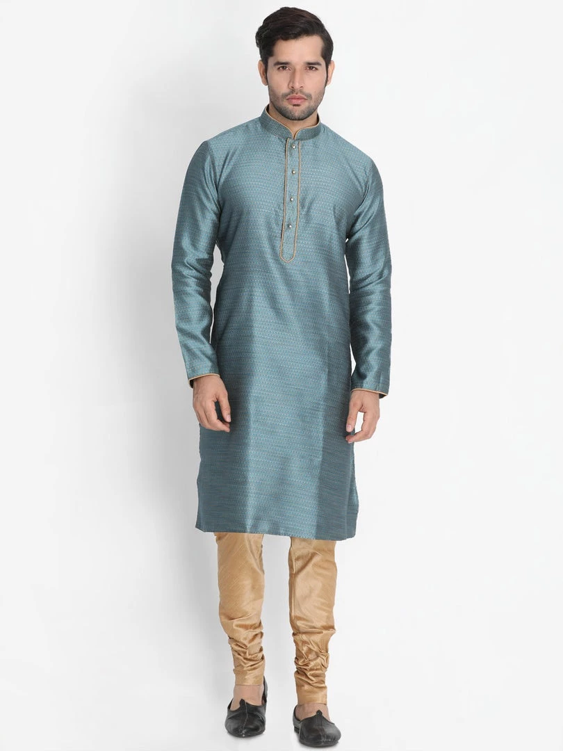 Aqua and beige woven straight knee length kurta, has a mandarin collar, button placket, long sleeves, straight hem
