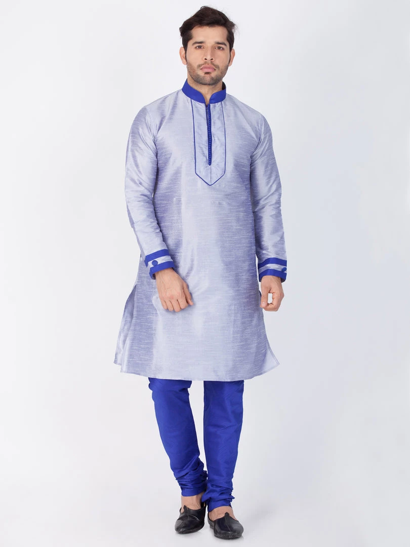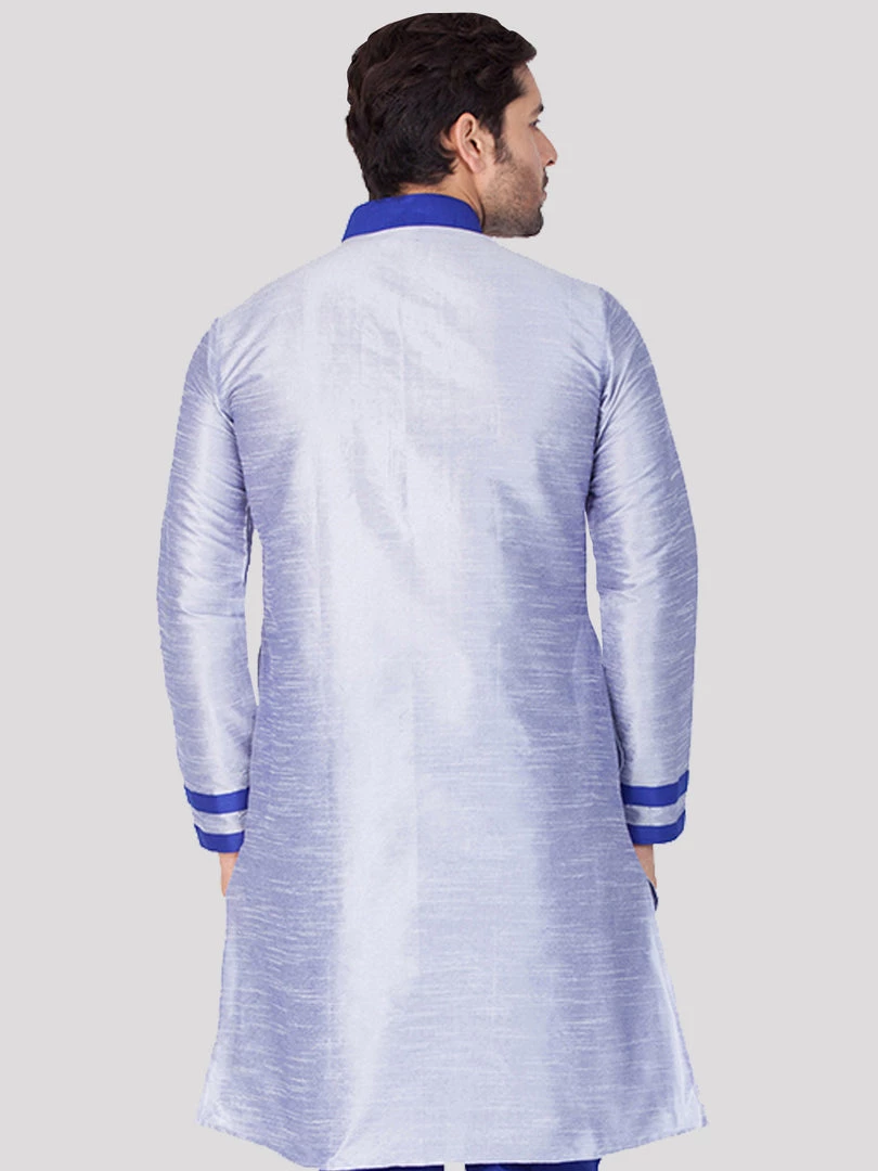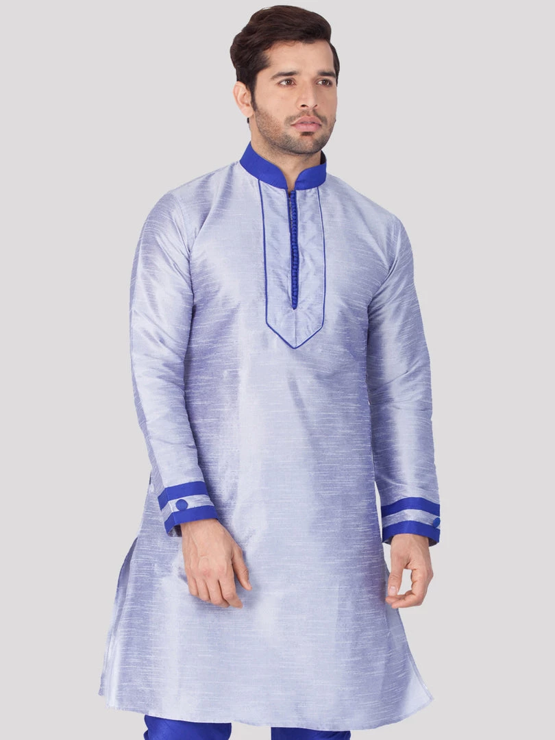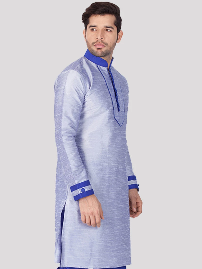 Light blue solid straight kurta, has a dark blue blue mandarin collar, long sleeves, button placket, contrast dark blue border on sleeves, straight hem, and side slits