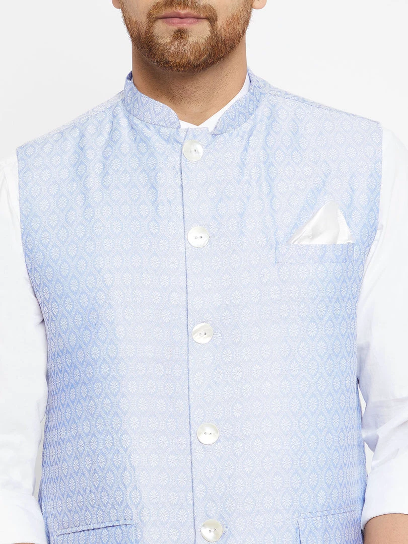 Classic silk-blend Nehru Jacket, has a mandarin collar, sleeveless, a full button placket, three pockets, straight hem. Comes with a pocket square.