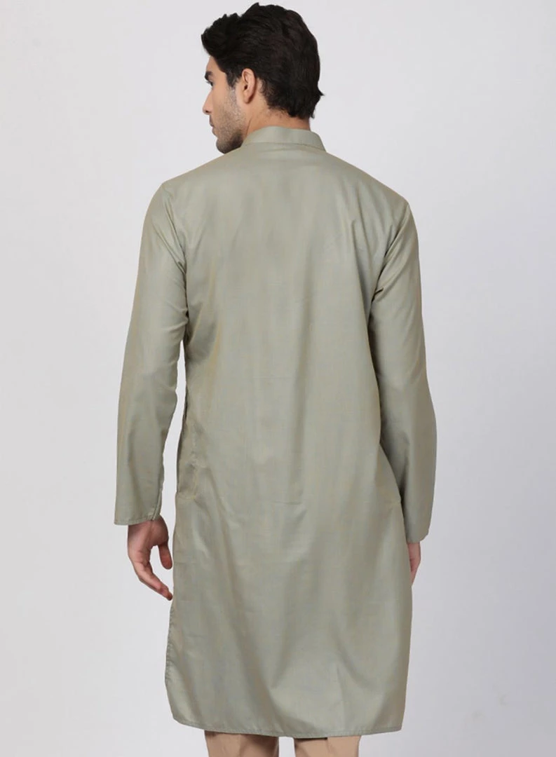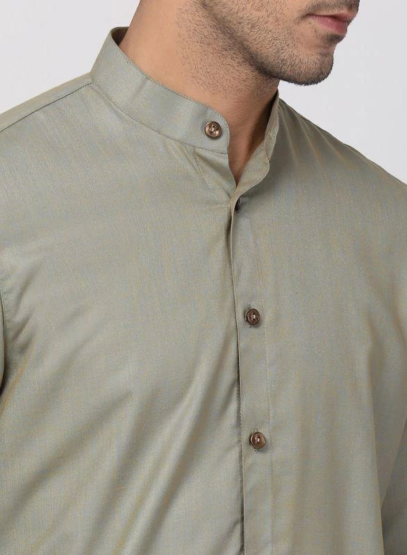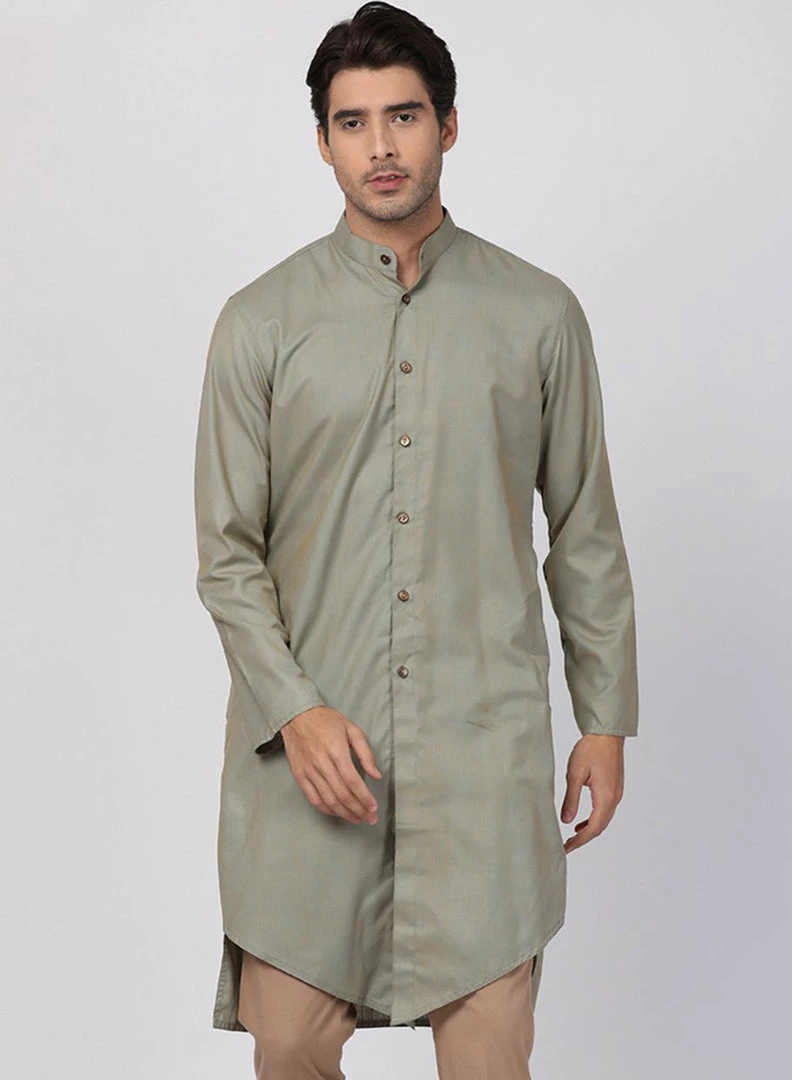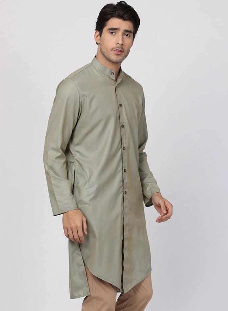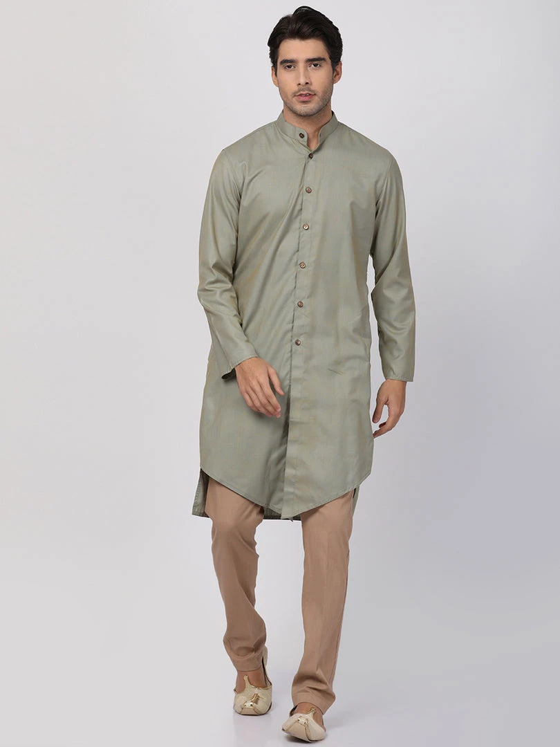 Light green knee length kurta, has a mandarin collar, full front button placket, long sleeves, Asymmetric hem, side slits