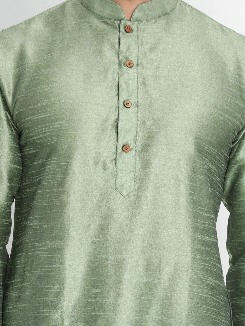 Light green solid straight knee length kurta, has a mandarin collar, button placket, long sleeves, straight hem