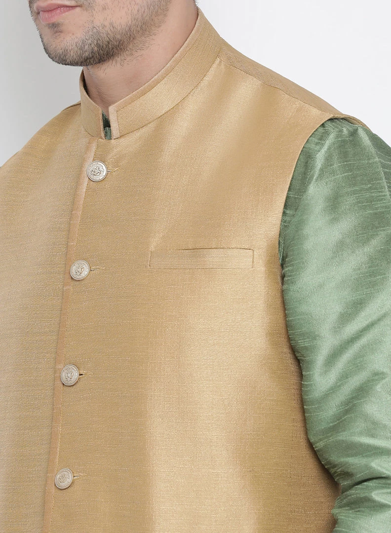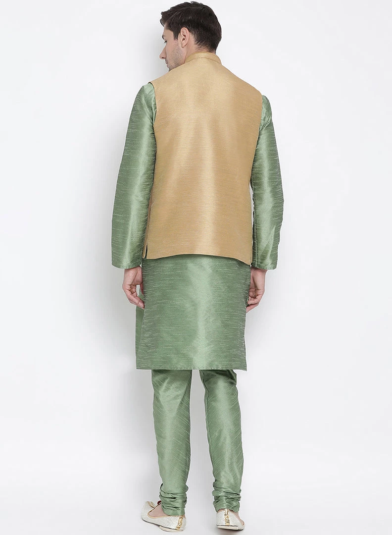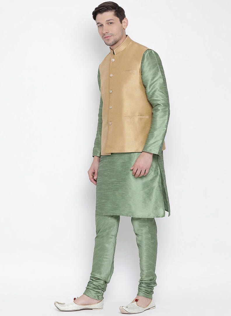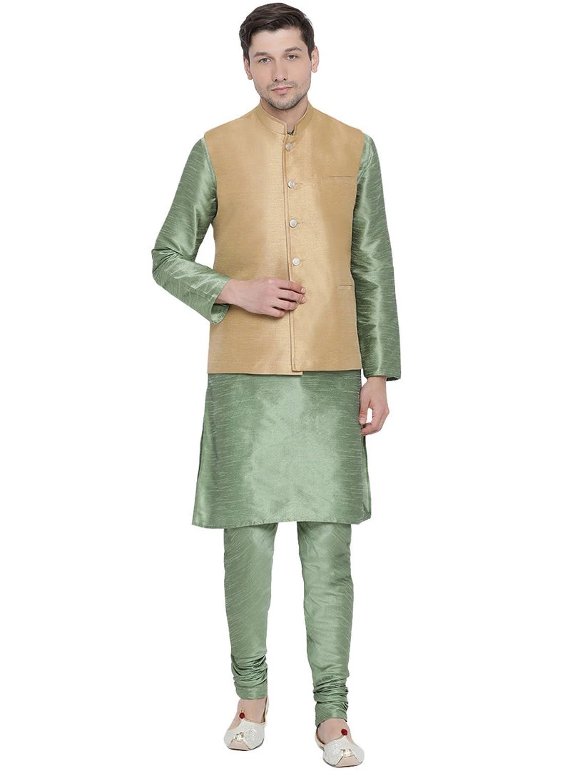 Light green solid kurta with solid churidar and beige Nehru jacket