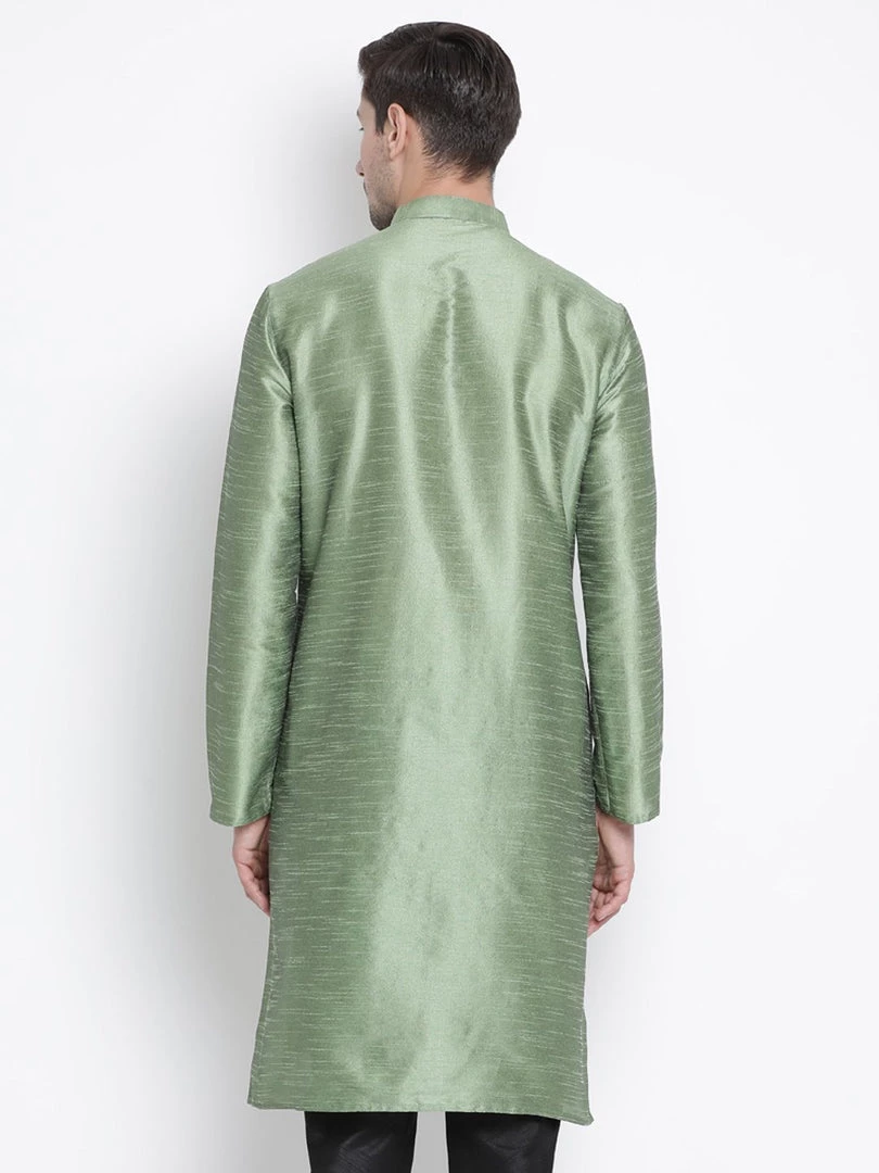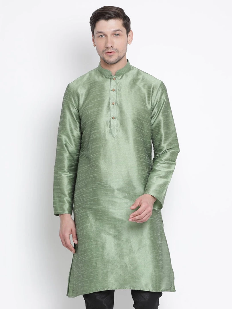 Light green solid straight kurta, has a mandarin collar, long sleeves, straight hem, and side slits