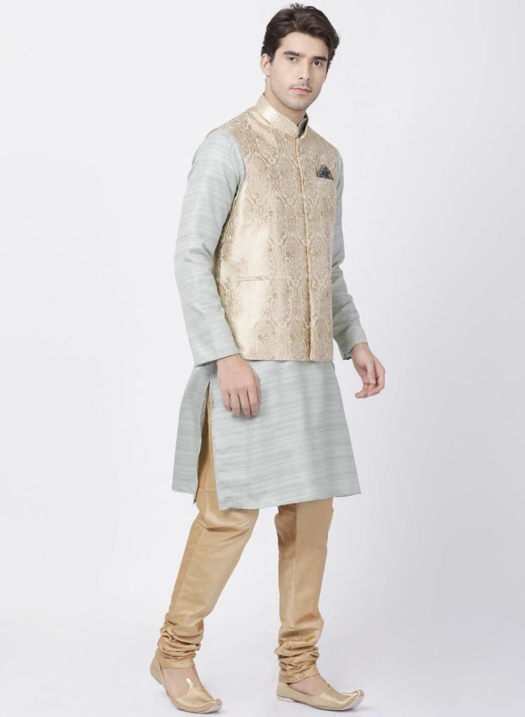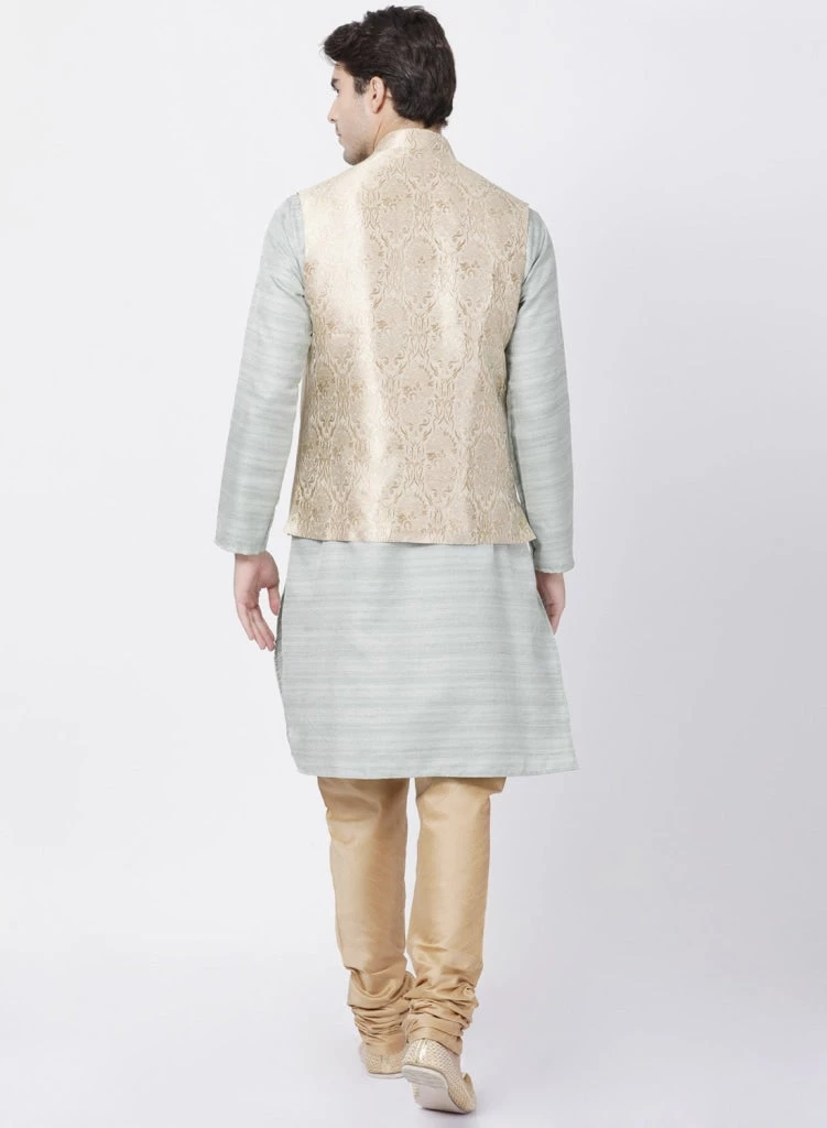 Grey woven kurta with solid churidar and beige Nehru jacket