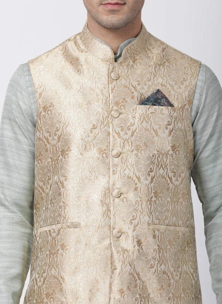 Beige and gold-toned woven Nehru jacket, has a mandarin collar, a full button placket, sleeveless, three welt pocket