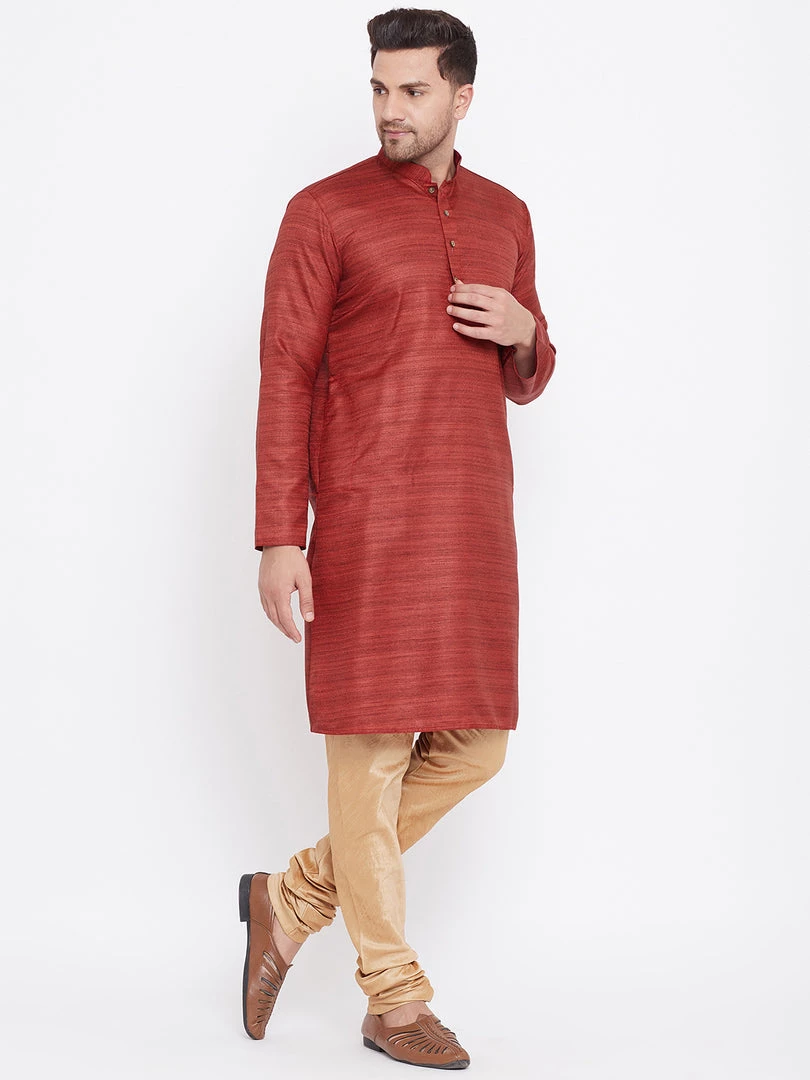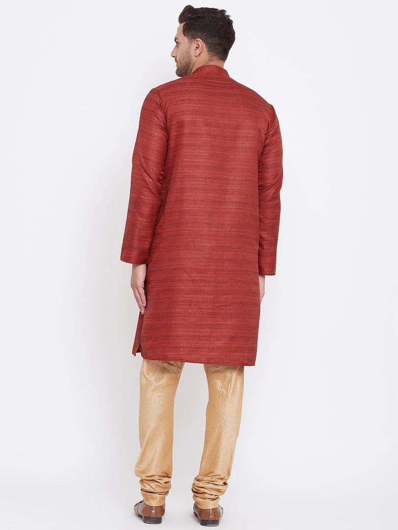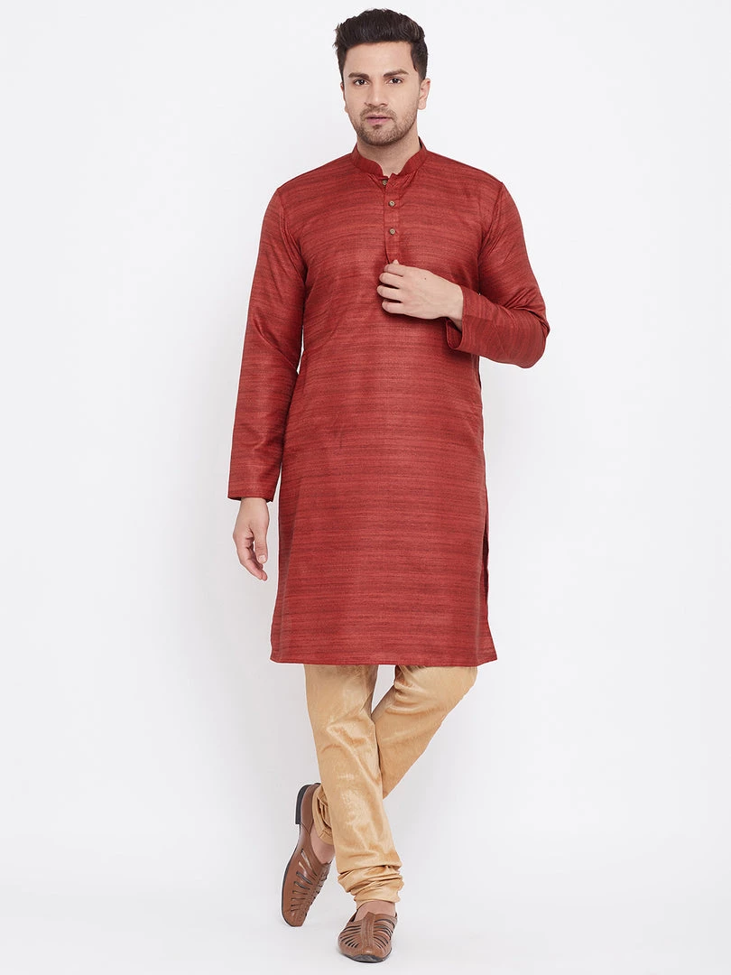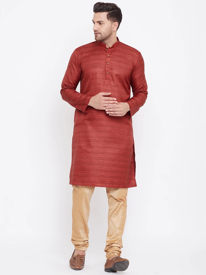 Maroon silk blend straight knee length kurta, has a mandarin collar, long sleeves, button placket, straight hem.