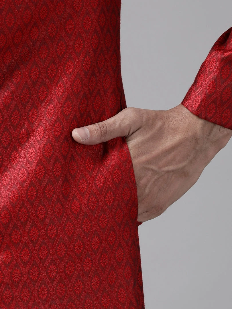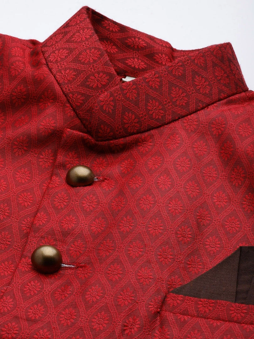 Maroon self-design sherwani, has a mandarin collar, long sleeves, button closure, multiple slits, three pockets, an attached lining
